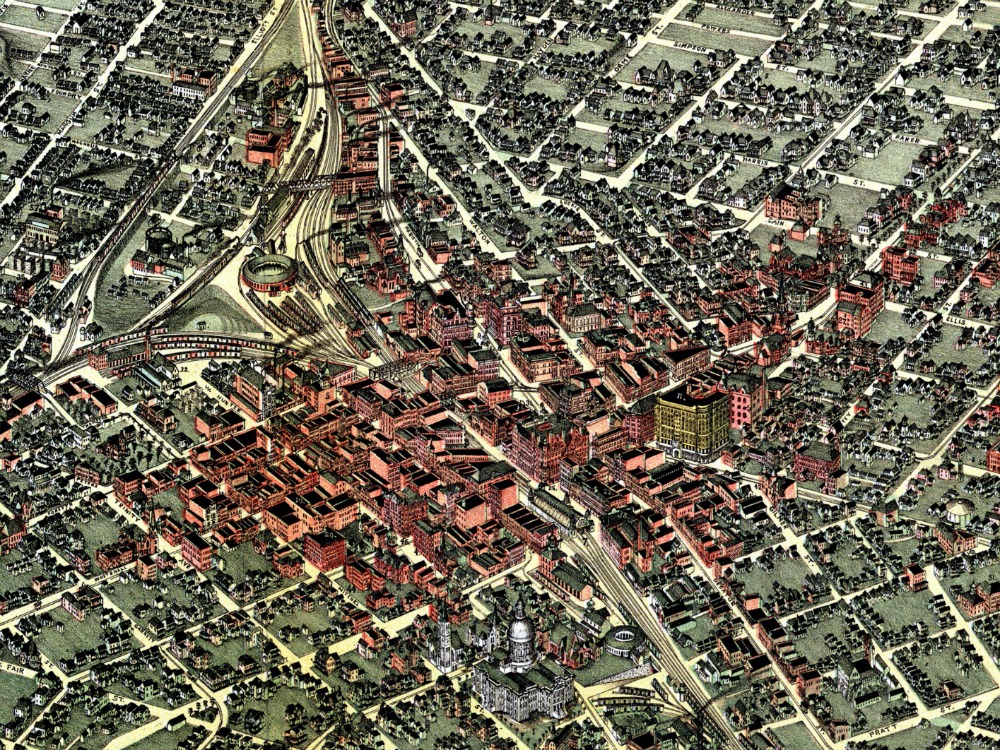 Birdseye view of Atlanta, Georgia from 1892. The map shows the early street layout of the city with magnificent full colour and intricate detail.