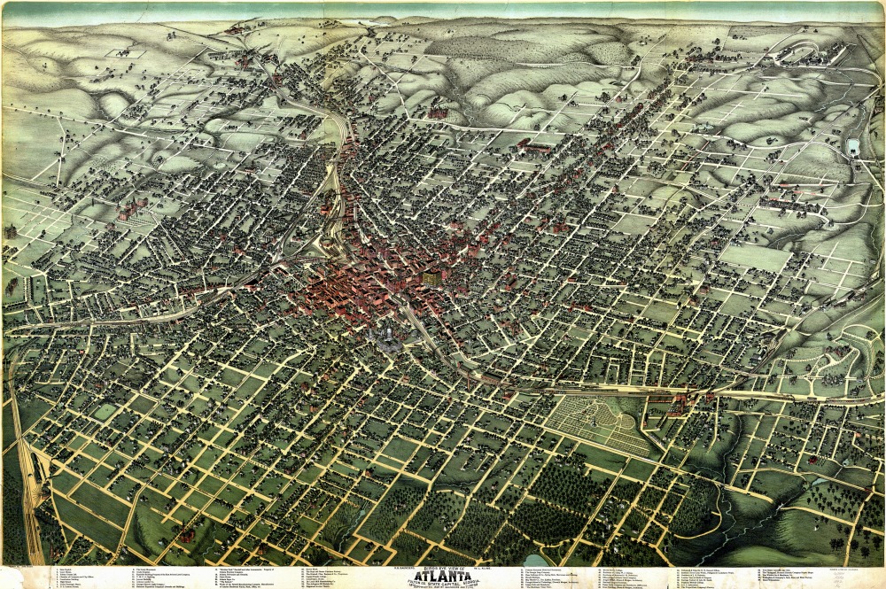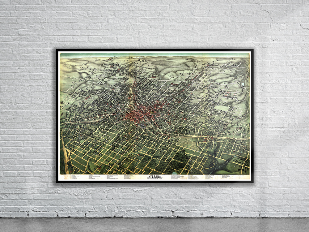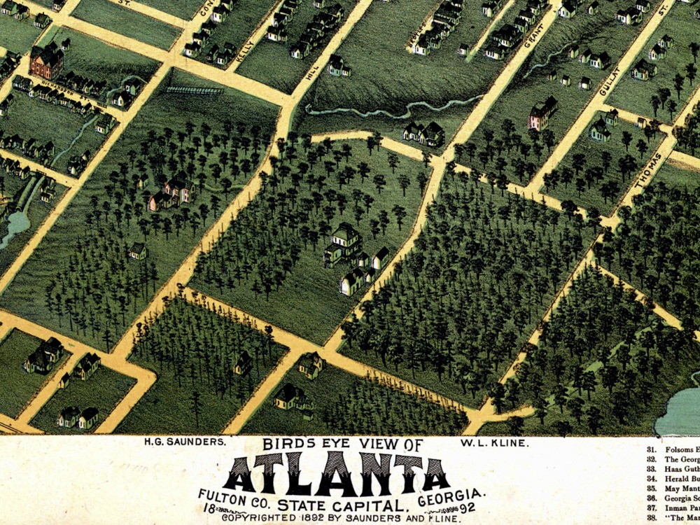 Birdseye view of Atlanta, Georgia from 1892. The map shows the early street layout of the city with magnificent full colour and intricate detail.