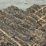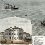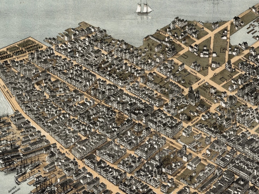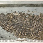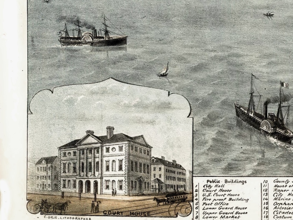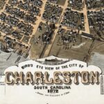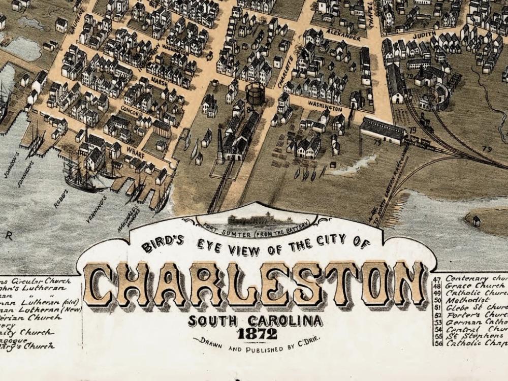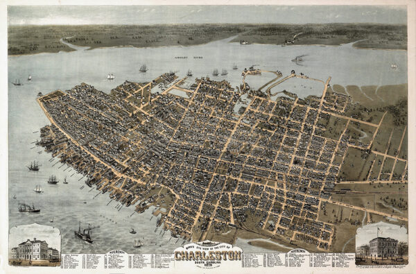 Brie’s Birdseye View of Charleston, SC from 1872. The Map is drawn from the pperspective of the Cooper river and includes colored illustrations of Fort Sumter (from the Battery), the Court House, City Hall and an index to points of interest.