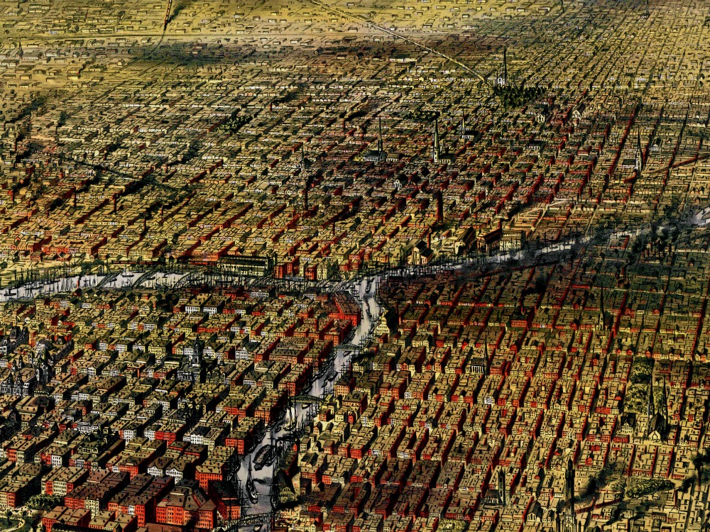 Birdseye view of Chicago, Illinois from 1874. The map shows the early street layout of the city with magnificent full colour and intricate detail.