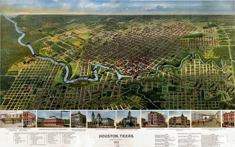 Birdseye view of Houston, Texas from 1891. The map depicts the early street layout of the city with magnificent full colour and intricate detail. The vignette along the bottom shows some of the most famous buildings and landmarks of the period.