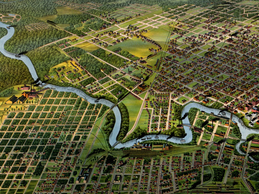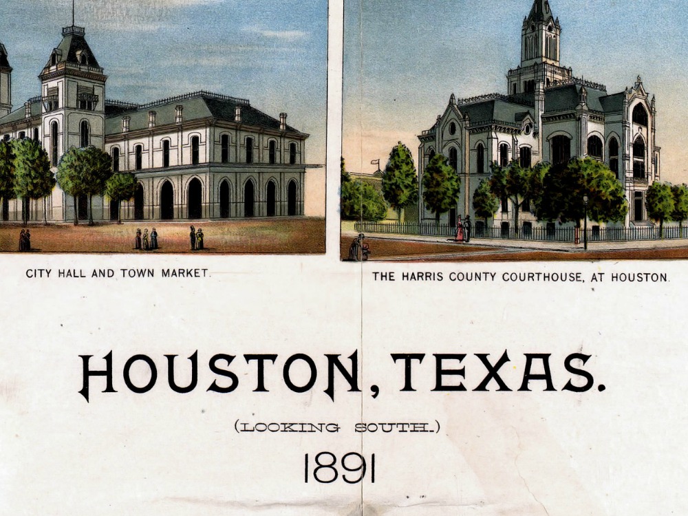 Birdseye view of Houston, Texas from 1891. The map depicts the early street layout of the city with magnificent full colour and intricate detail. The vignette along the bottom shows some of the most famous buildings and landmarks of the period.