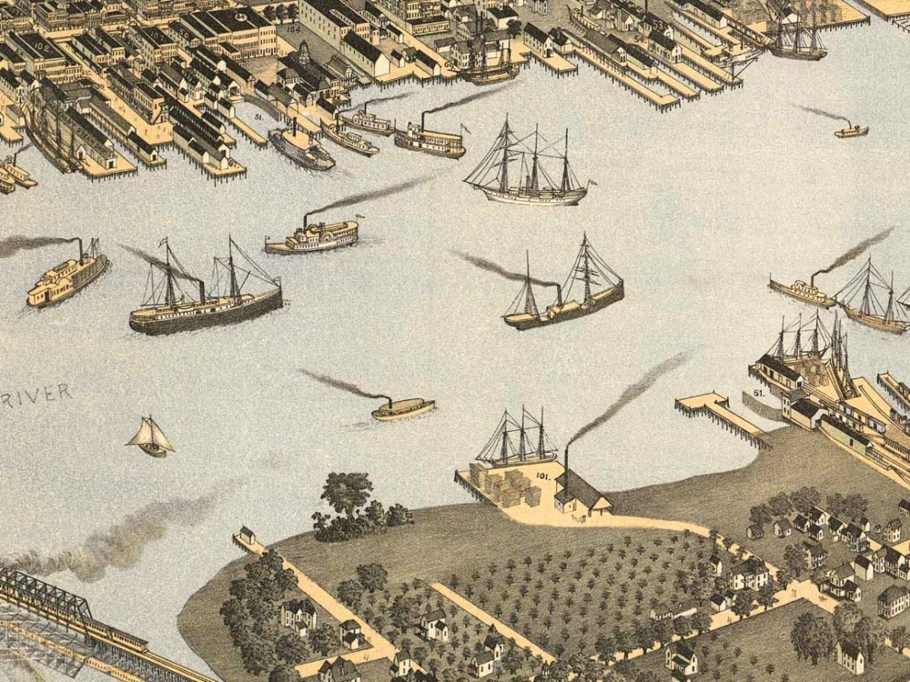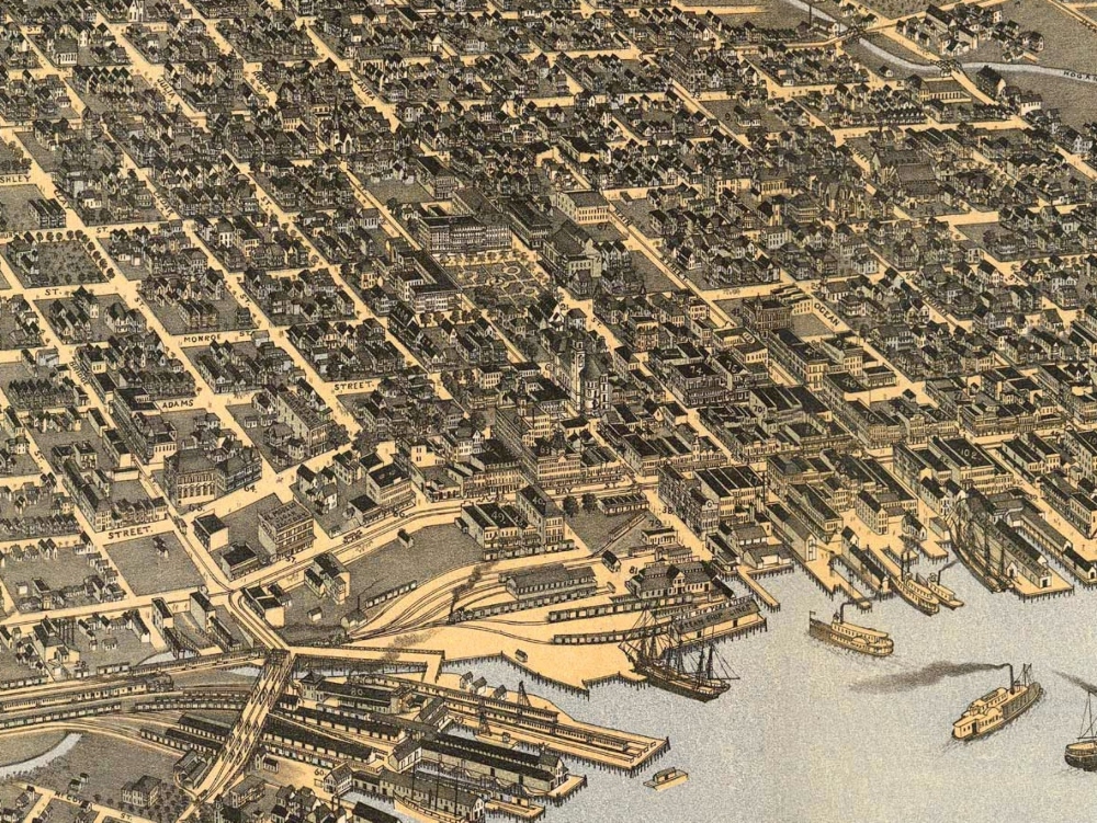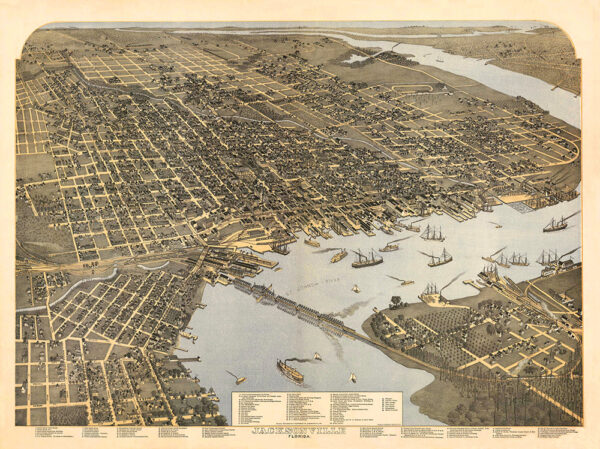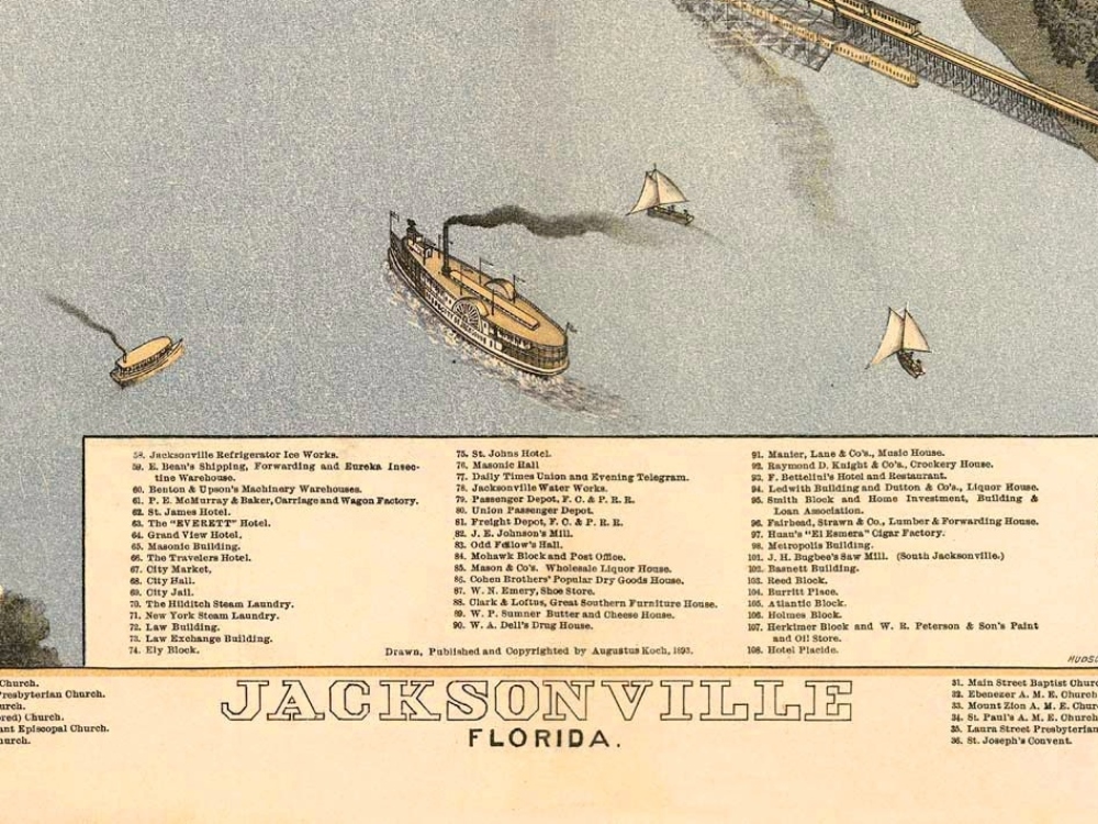 A Birdseye View of Jacksonville, Florida from 1893. Steamboats on the St. John’s River are shown in the foreground.