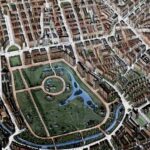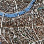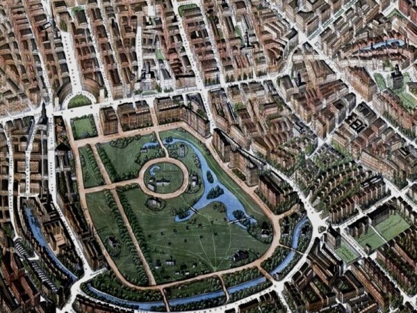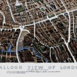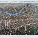 A “Balloon” view of London from 1851. The Map is actually from the North looking South so the traditional shape of London depicted on maps is flipped.