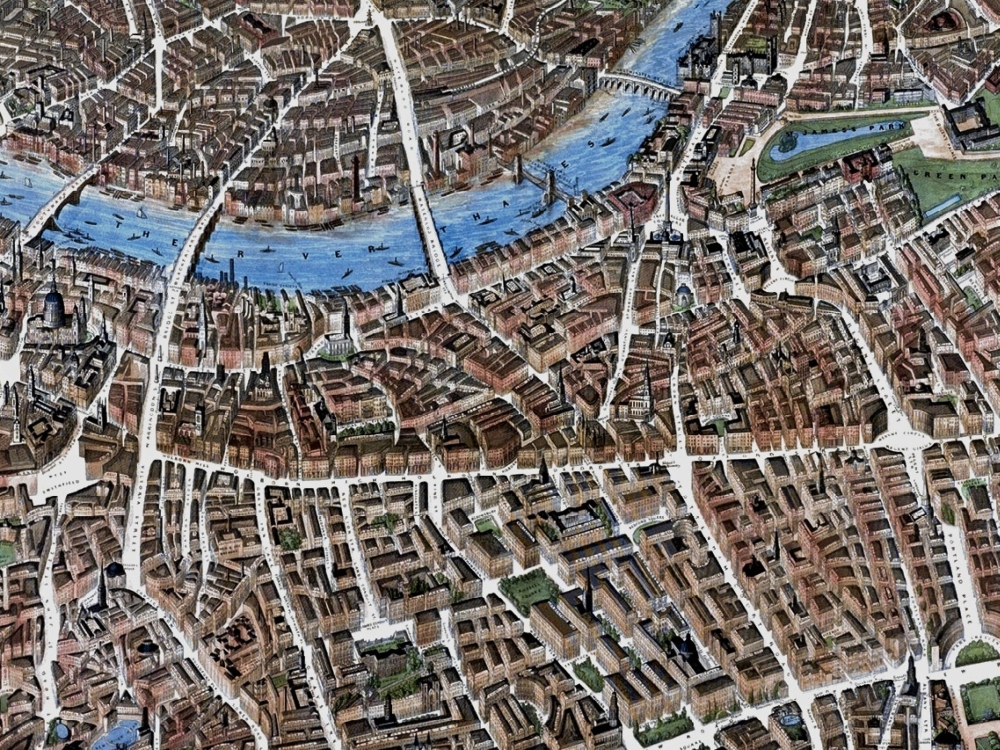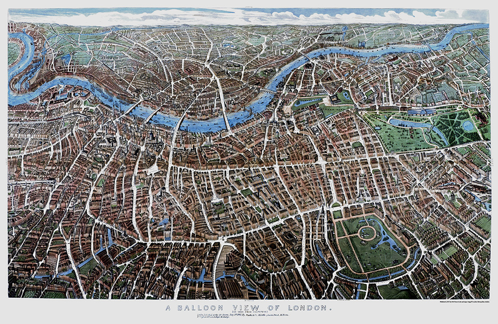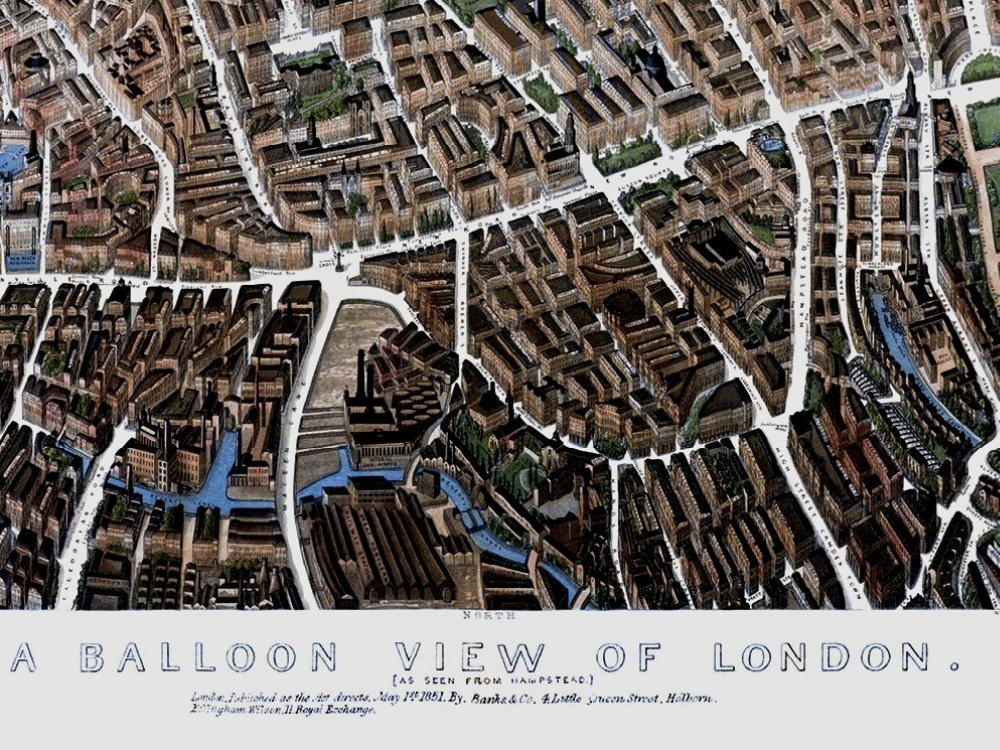 A “Balloon” view of London from 1851. The Map is actually from the North looking South so the traditional shape of London depicted on maps is flipped.