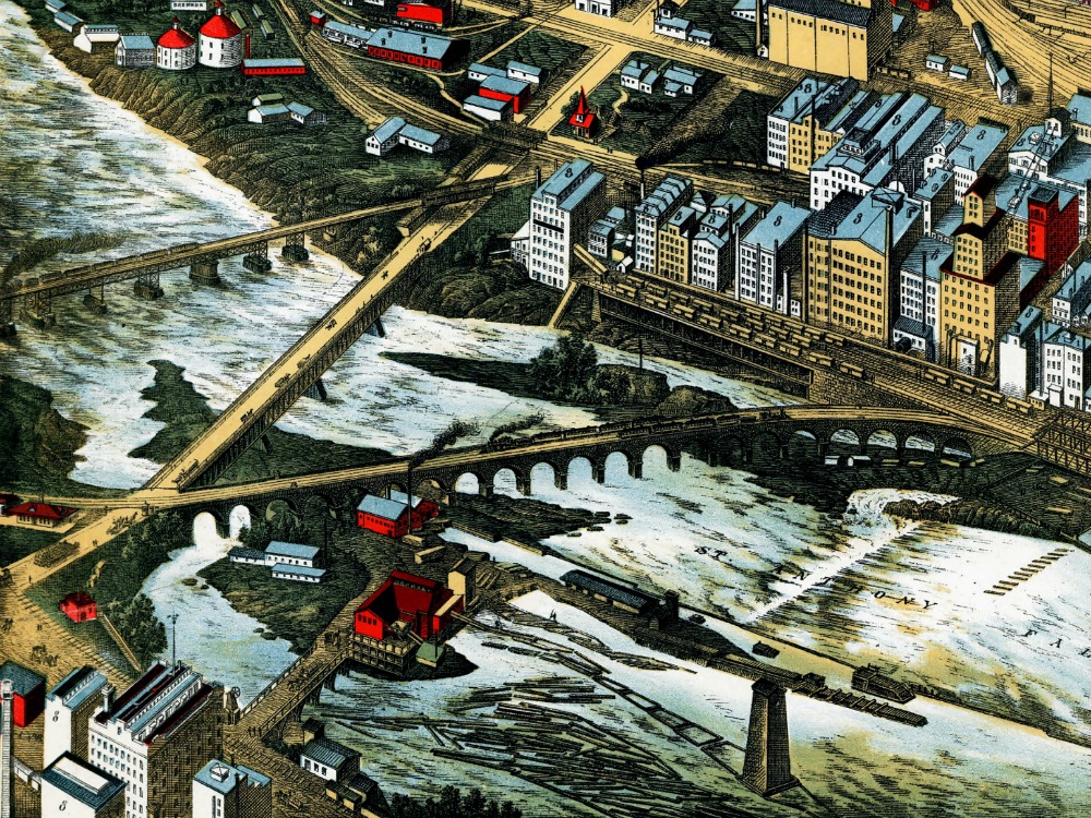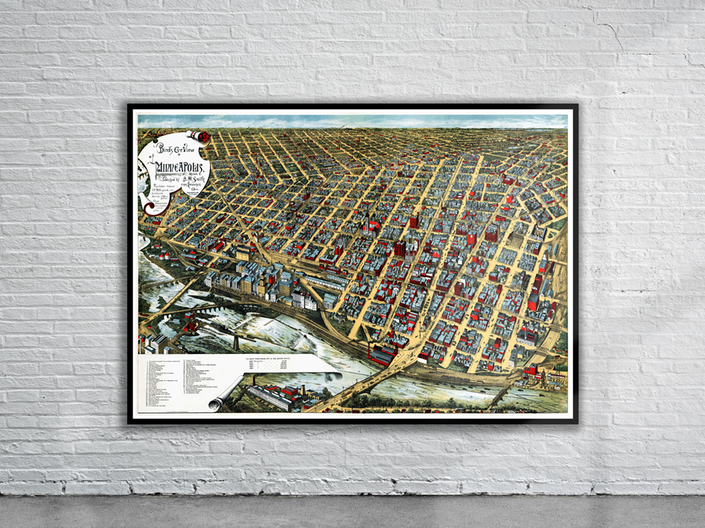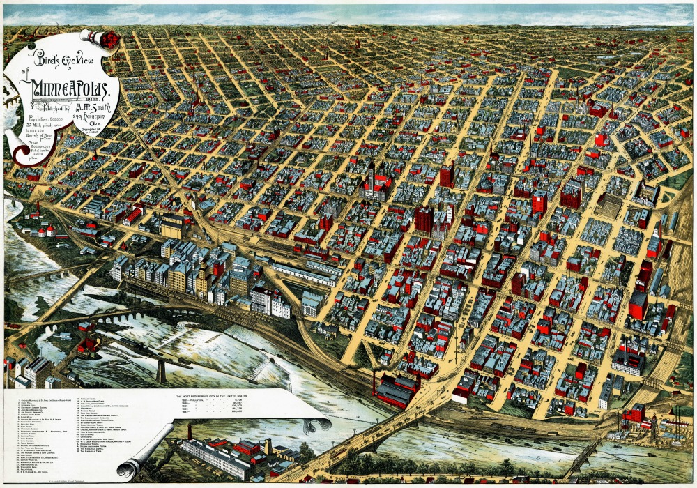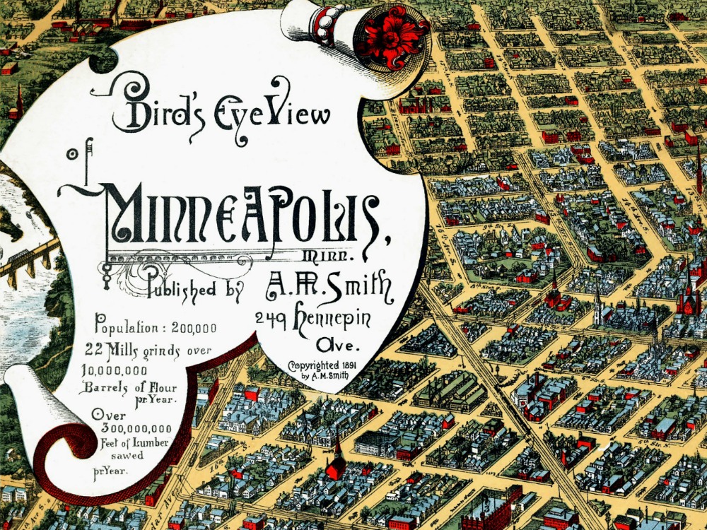 Birdseye view of Minneapolis, Minnesota from 1891. The map shows the Mississippi River and early street layout of the city with magnificent full colour and intricate detail.