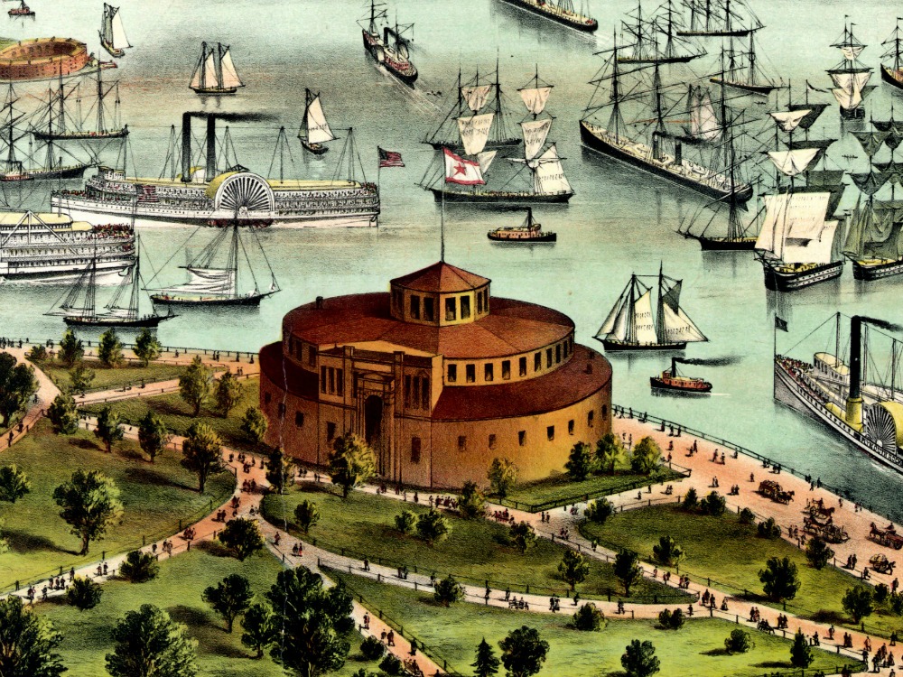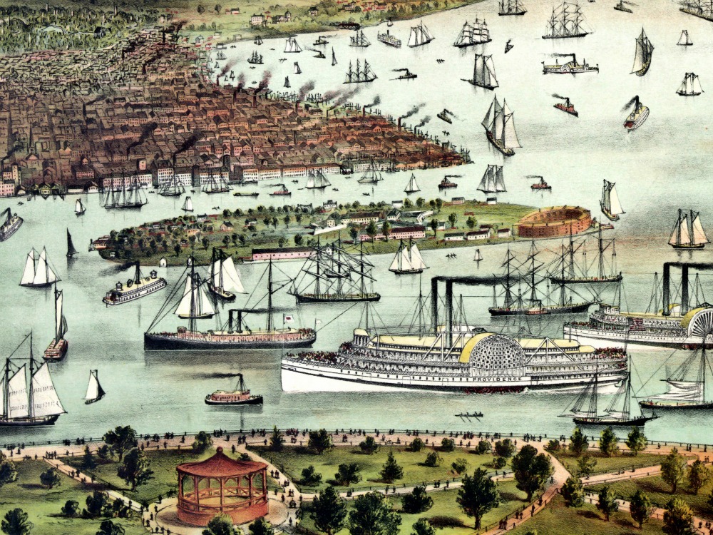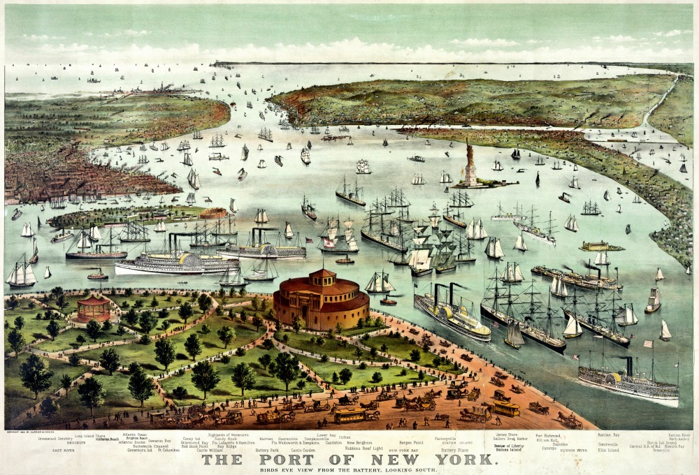 Birdseye view of New York City from 1890. The map shows the harbour including the Statue of Liberty and the early street layout of the city with magnificent full colour and intricate detail.