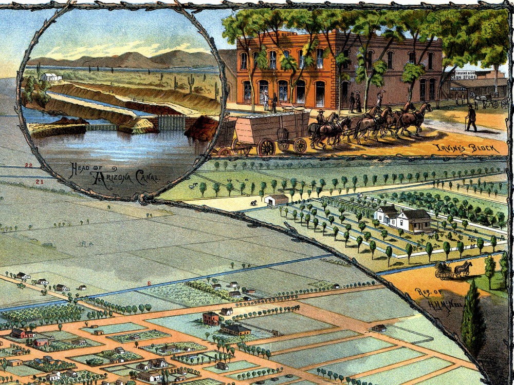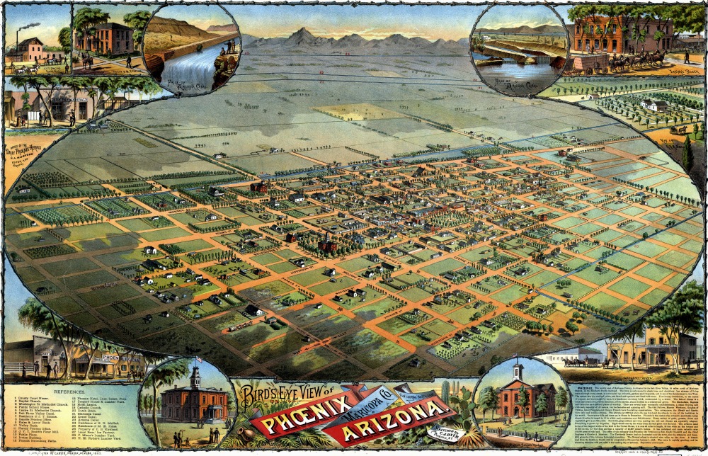 Birdseye view of Phoenix, Arizona from 1885. The map depicts the early street layout of the city with magnificent full colour and intricate detail. The four corners show images of some of the city’s original buildings.