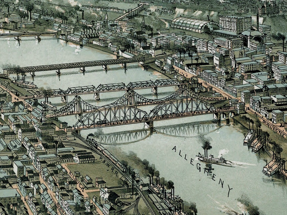 Birdseye view of Pittsburgh, Pennsylvania from 1902. The map shows the confluence of the Allegheny and Ohio Rivers and early street layout of the city with magnificent full colour and intricate detail.