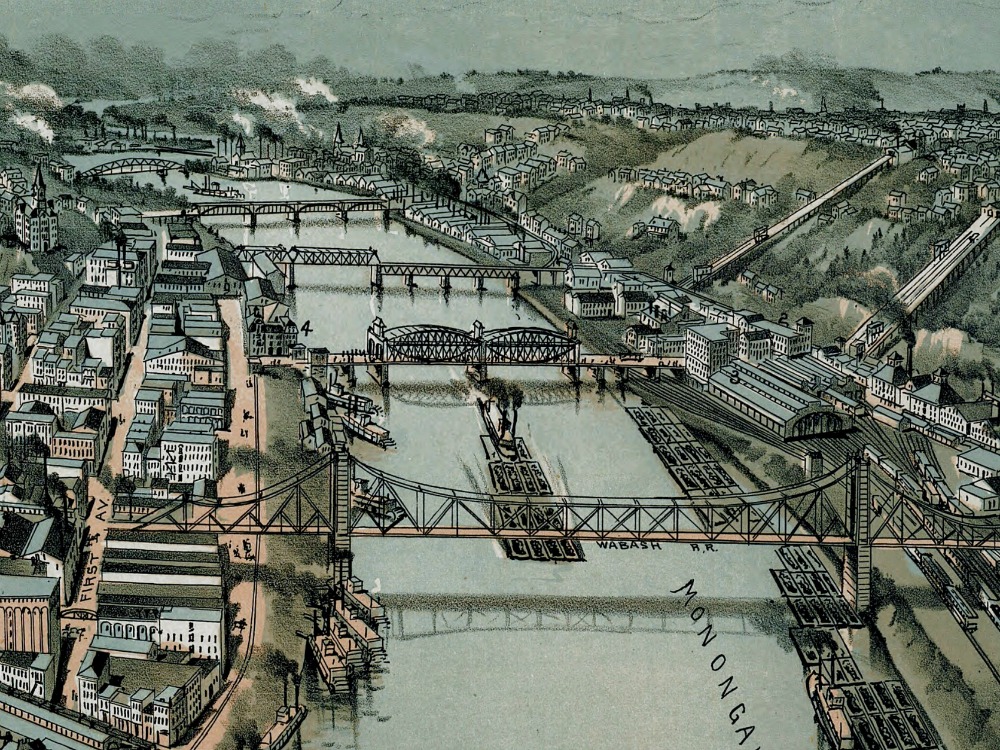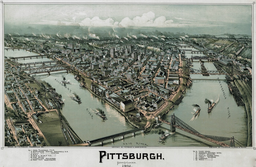 Birdseye view of Pittsburgh, Pennsylvania from 1902. The map shows the confluence of the Allegheny and Ohio Rivers and early street layout of the city with magnificent full colour and intricate detail.