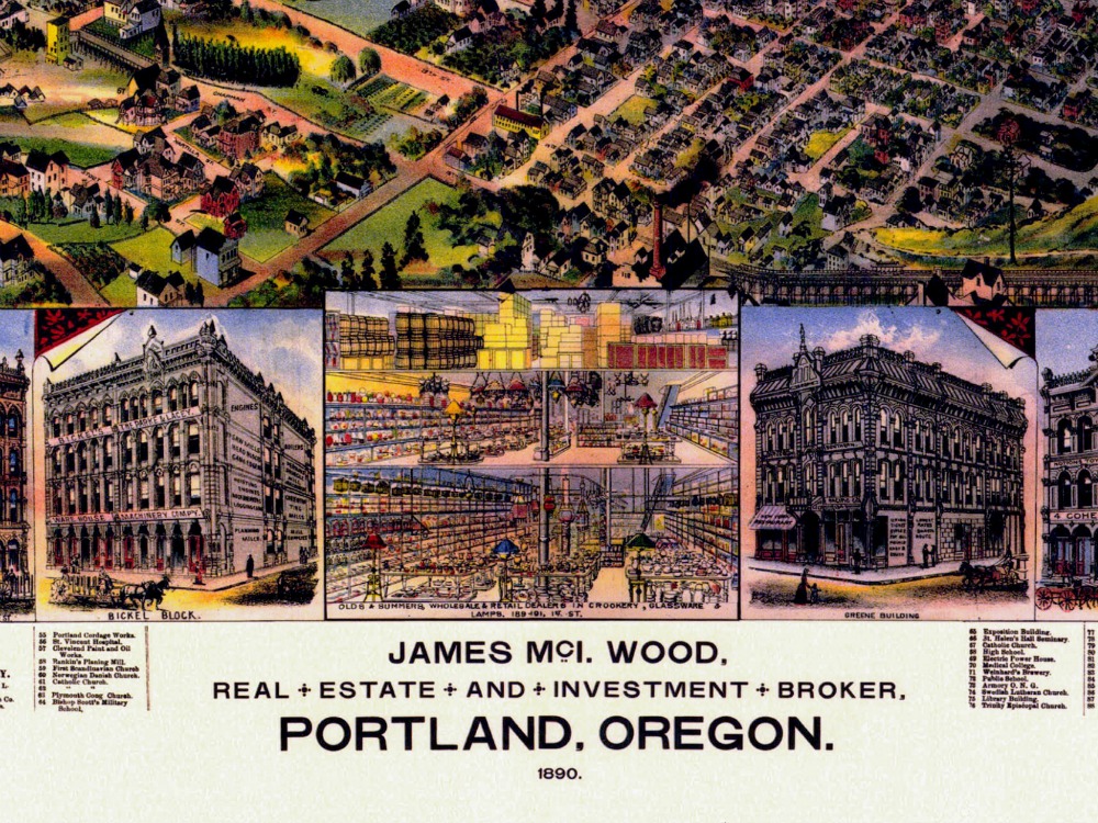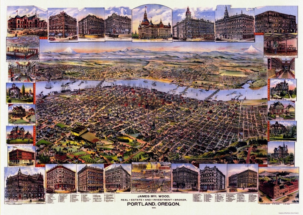 Birdseye view of Portland, Oregon from 1890. The map depicts the early street layout of the city with magnificent full colour and intricate detail. The vignette on all four sides shows some of the most famous buildings and landmarks of the era.