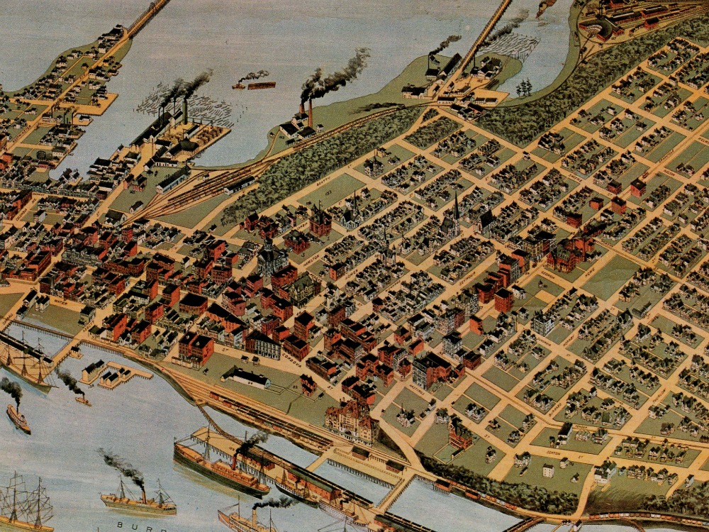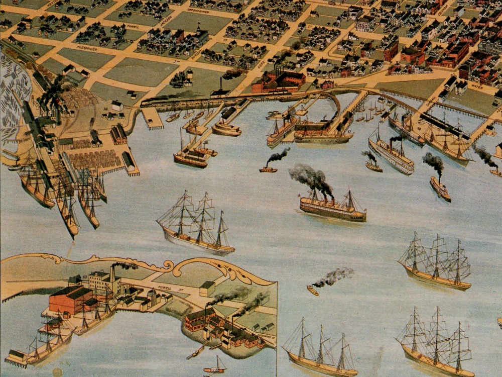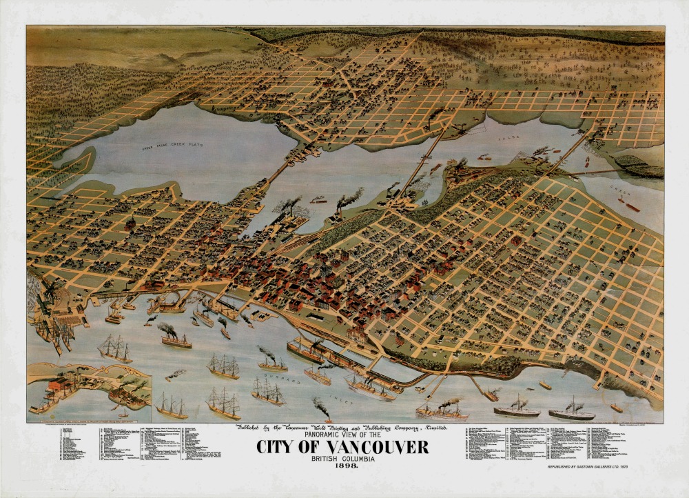 Birdseye view of Vancouver, British Columbia from 1898. The map depicts the harbour and the early street layout of the city with magnificent full colour and intricate detail.
