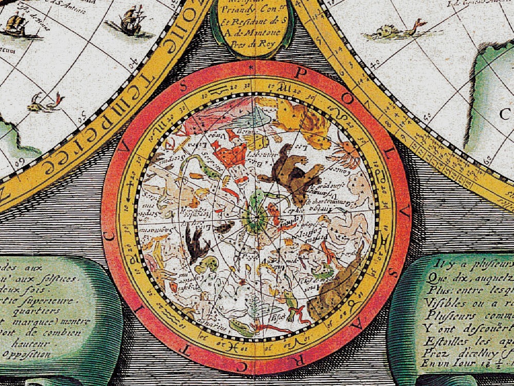 Boisseau’s Map of the World from 1646. A stunningly detailed map which includes two celestial spheres, text panels with geographical and astronomical data, the names of the winds an the heavenly orbits, and a circular diagram showing compass points.