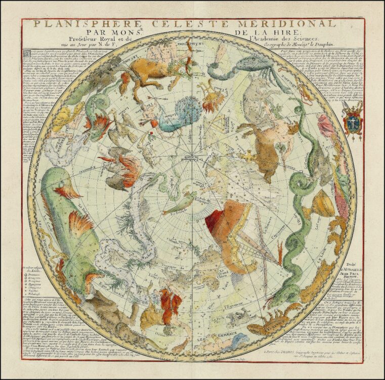 Vintage Cellestial Map of the Constellations of the Southern Hemisphere, designed by Gabriel Phillipe de la Hire from 1760.