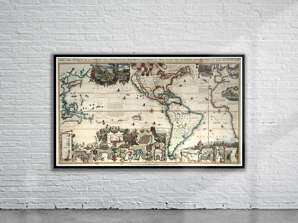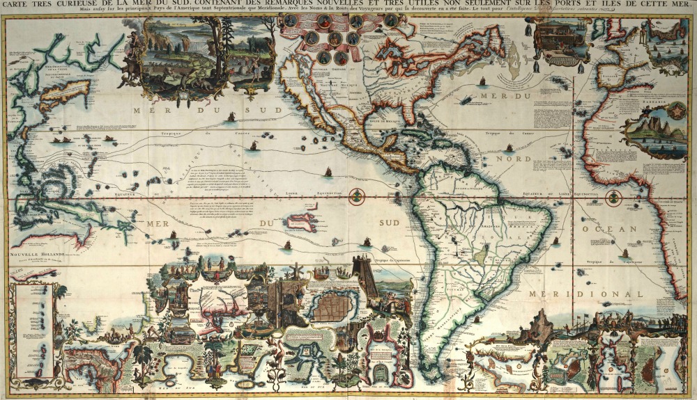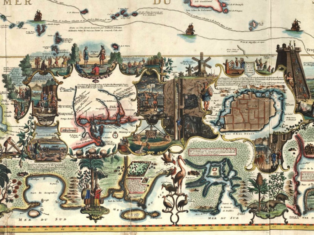 Chatelain’s fascinating map of the world from 1719. he map contains a plethora of geographic information. It tracks the routes of a number of great voyages, including the first encounter with the New World by Columbus in 1492. Also included are two vignettes of beavers, one showing them constructing a dam and the other showing them being hunted by indigenous people. California is shown as an island.