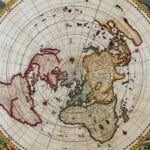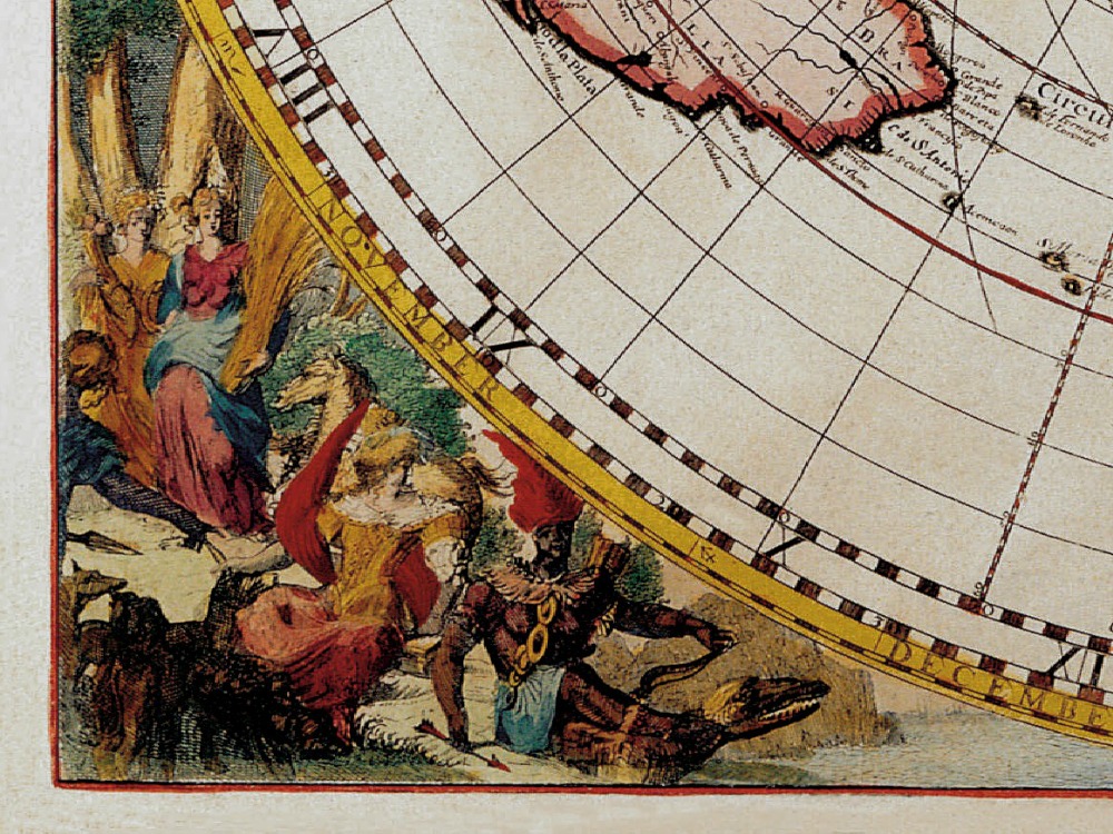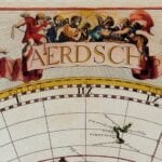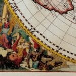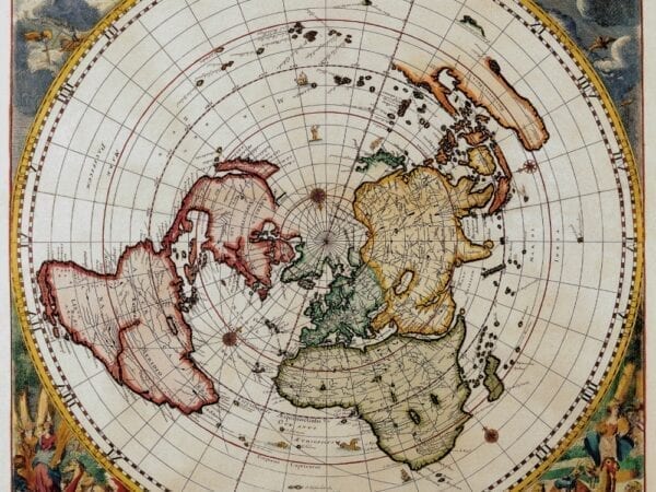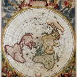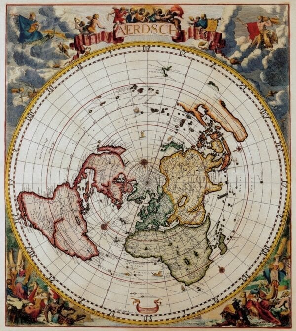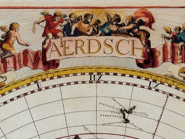 This magnificent world map on a single polar projection by Cornellis Dankertz is knows as “The Map from the Top of the World”.The map is presented in a circular form on the equidistant azimuthal projection created by Le Mayerne Turquet in 1648, in which the latitudes appear as equidistant concentric circles. In North America, only one Great Lake is depicted, and Nieu Nederland appears on the East Coast as opposed to New York, as it was renamed in 1644. California is shown as an island with a flat northern coastline. In South America, the two mythical lakes Parime Lacus and Xarayes are depicted. Parts of New Zealand and Tasmania are also shown.