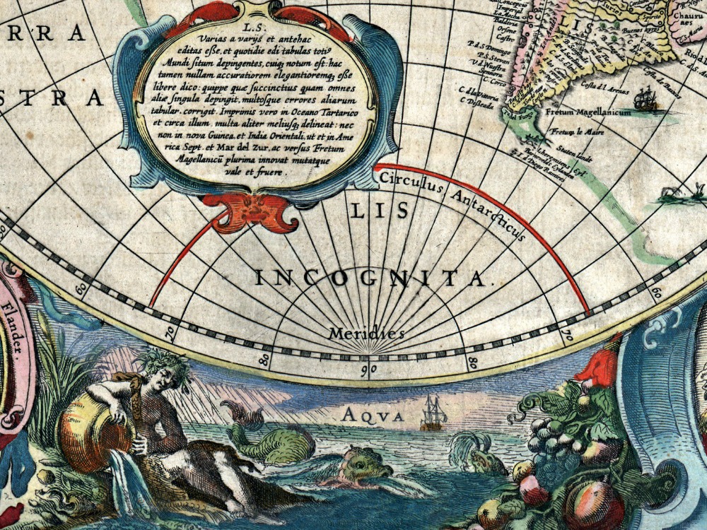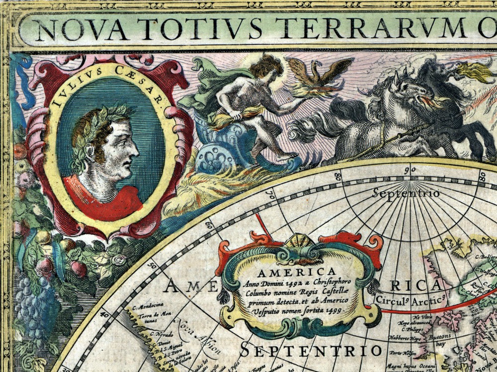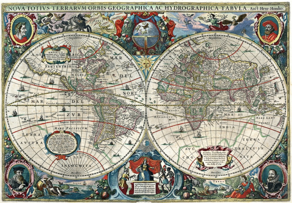 Hondius’s 1641 world map is set in a double hemisphere form and embellished with cartouches, ships and sea monsters, decorative borders incorporating vignettes of the four elements and portrait medallions of Caesar, Ptolemy, Mercator and Jodocus Hondius. A stunning map.