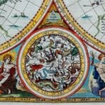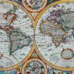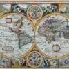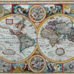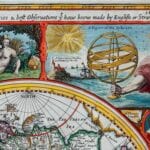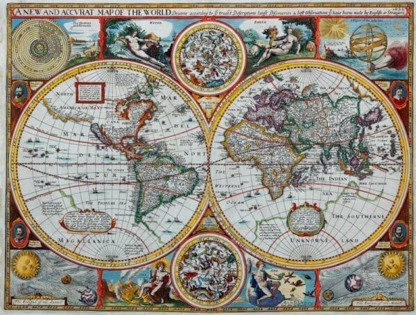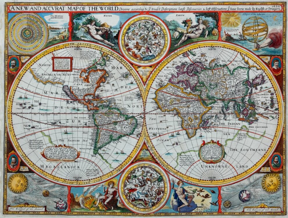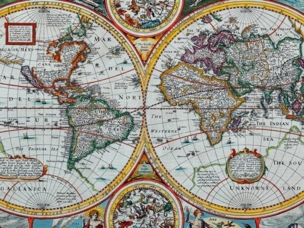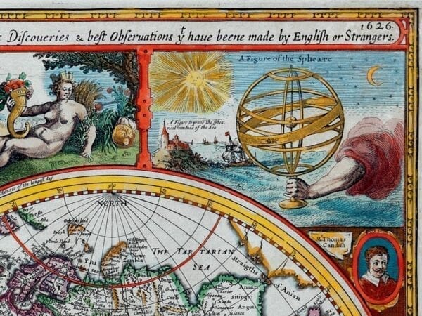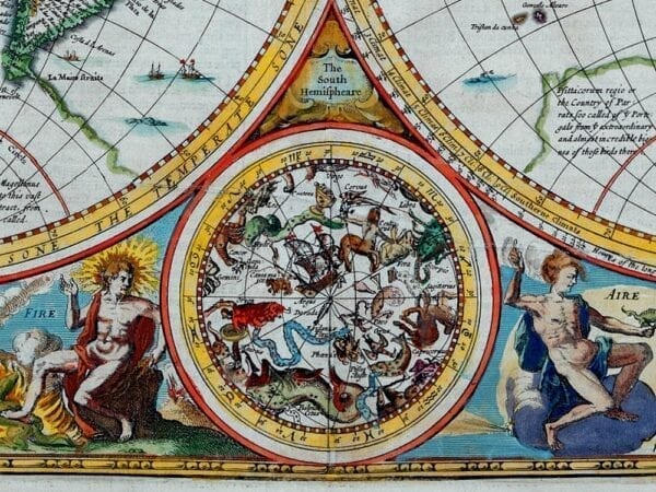 John Speeds famous double hemisphere World Map of 1646. The map is surrounded by smaller celestial hemispheres, representations of Water, Earth, Air, and Fire, and a number of celestial phenomena including solar and lunar eclipses. Portraits of some of the World’s most famous explorers are included at the corners of the map: Sir Francis Drake, Ferdinand Magellan, Thomas Cavendish and Olivier van Noort.