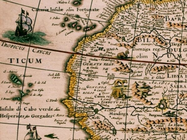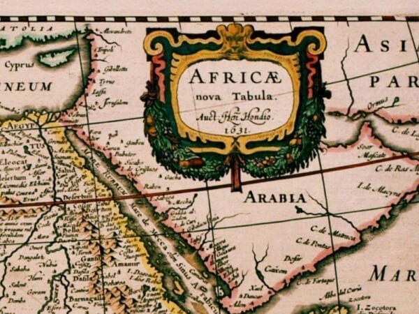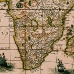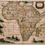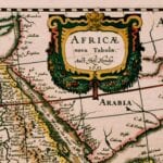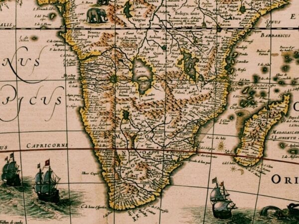 Hondius’ Map of Africa from 1631. The Kingdom of Monomotapa fills the entire southern tip of Africa. As well as a decorative cartouche, sailing ships, flying fish, various sea monsters adorn the sea and elephants, lions, zebras, ostriches and even a dragon occupy the interior.