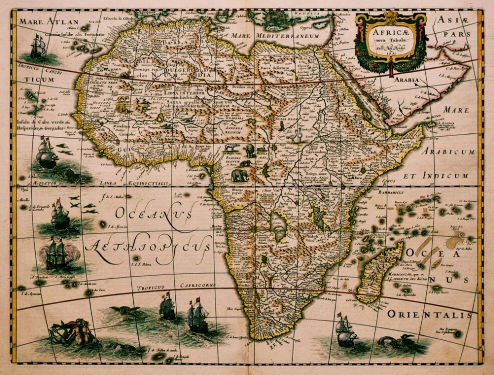 Hondius’ Map of Africa from 1631. The Kingdom of Monomotapa fills the entire southern tip of Africa. As well as a decorative cartouche, sailing ships, flying fish, various sea monsters adorn the sea and elephants, lions, zebras, ostriches and even a dragon occupy the interior.