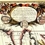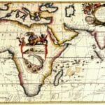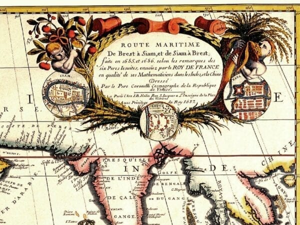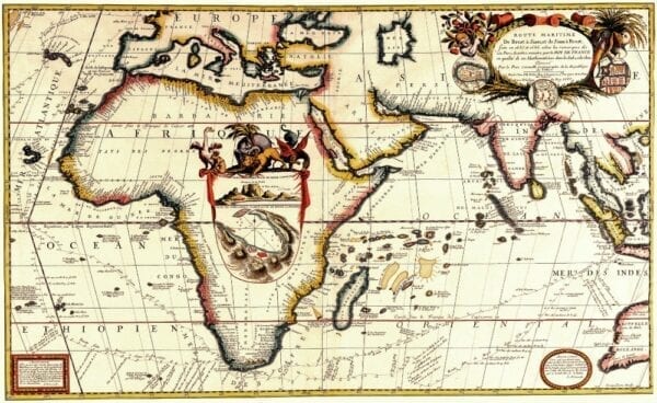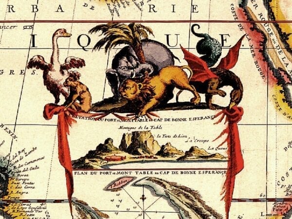 Coronelli’s “Route Maritime” Map of Africa and Southern Europe depicting the major shipping routes of the period. The Inset shows a plan of Capetown including Robben Island and a description of Table Mountain.