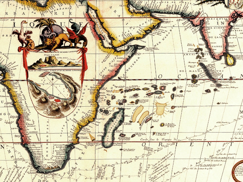 Coronelli’s “Route Maritime” Map of Africa and Southern Europe depicting the major shipping routes of the period. The Inset shows a plan of Capetown including Robben Island and a description of Table Mountain.