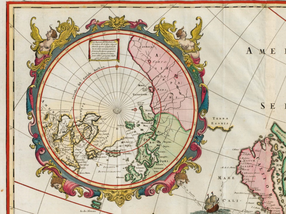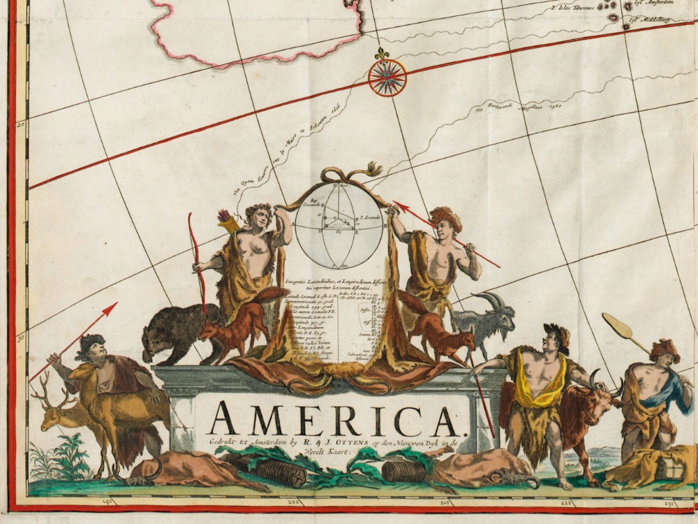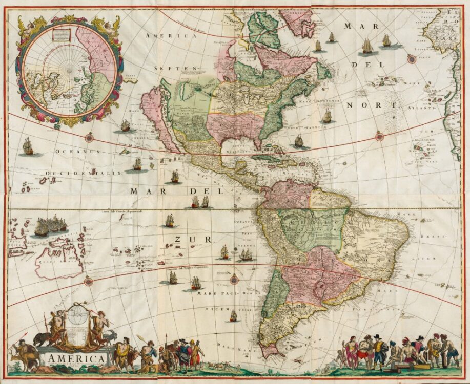 The spectacular Map of America by Frederick de Wit, from 1670. A spectacular and very detailed wall map of the new world. Here in its final state with completely updated geographic rendering of the original colonies, at a time of rapid discoveries and settlements inland.