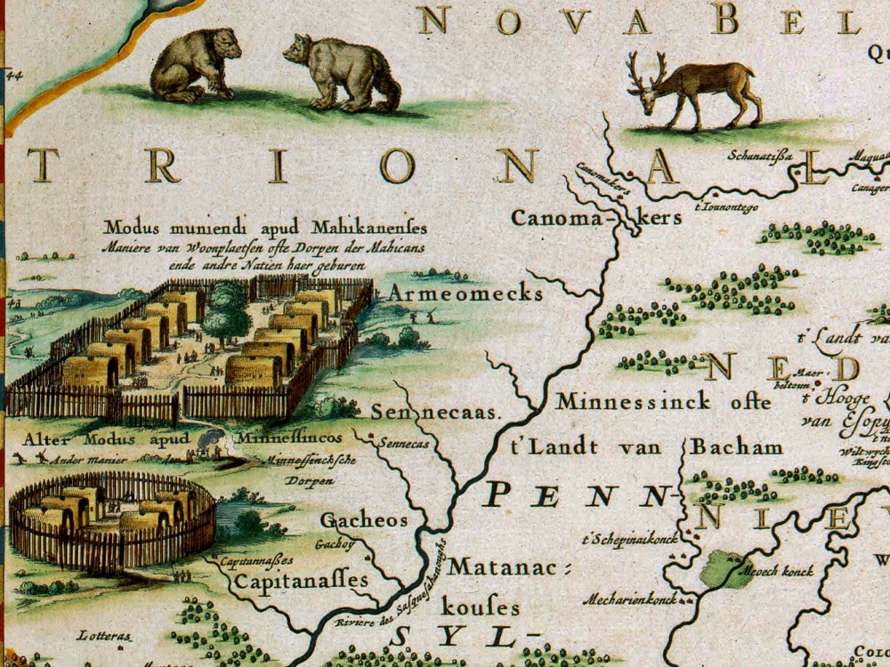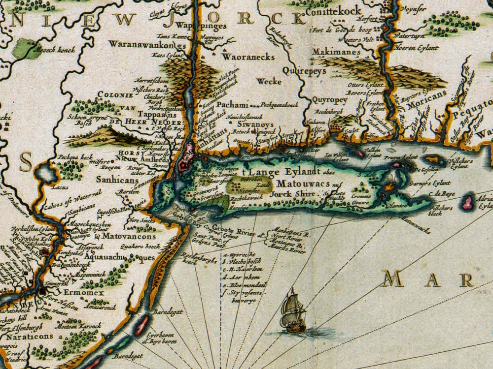 Justus Danckert’s map of New Netherlands from 1673, including an inset view of the Dutch colony on Manhattan Island. A magnificent full colour and very detailed map.