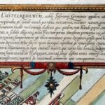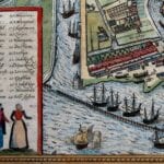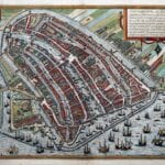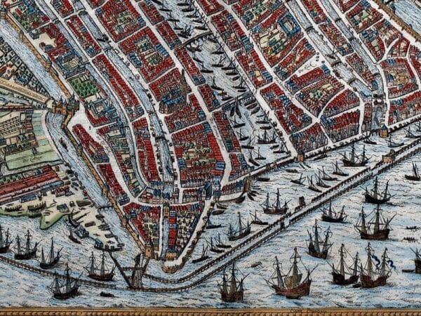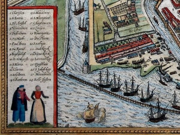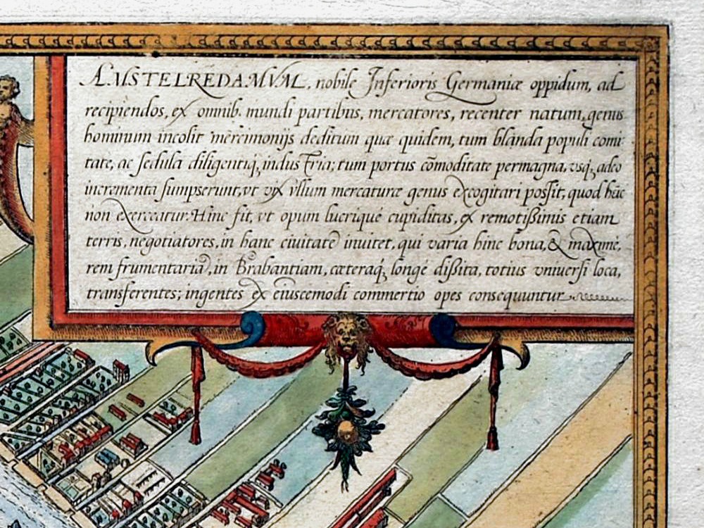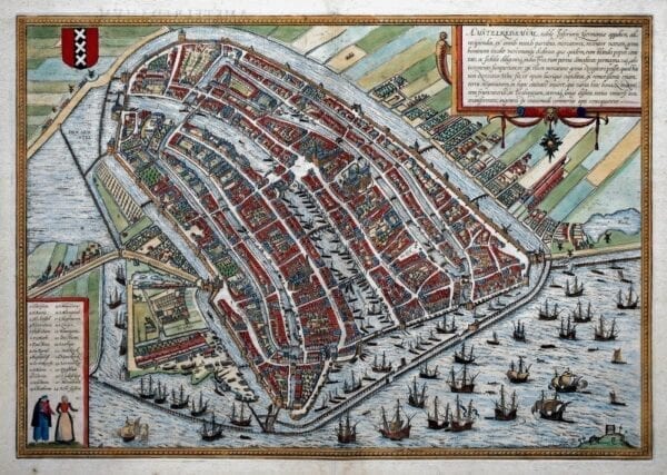 Stunning view of 16th Century Amsterdam from the German edition of the town book Civitates Orbis Terrarum by Braun and Hogenberg, printed in 1574. To the top left is a coat of arms, and to the top right is the title cartouche.
