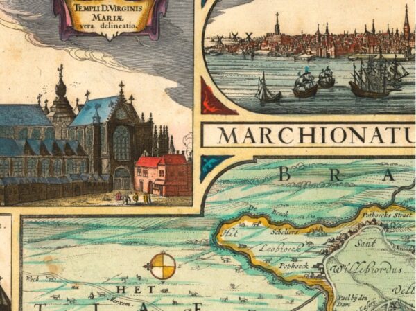Visscher’s 1696 map of the Marquisate of Antwerp, surrounded by 3 city views and 10 building vignettes. Inset of the southern region of Brabant.