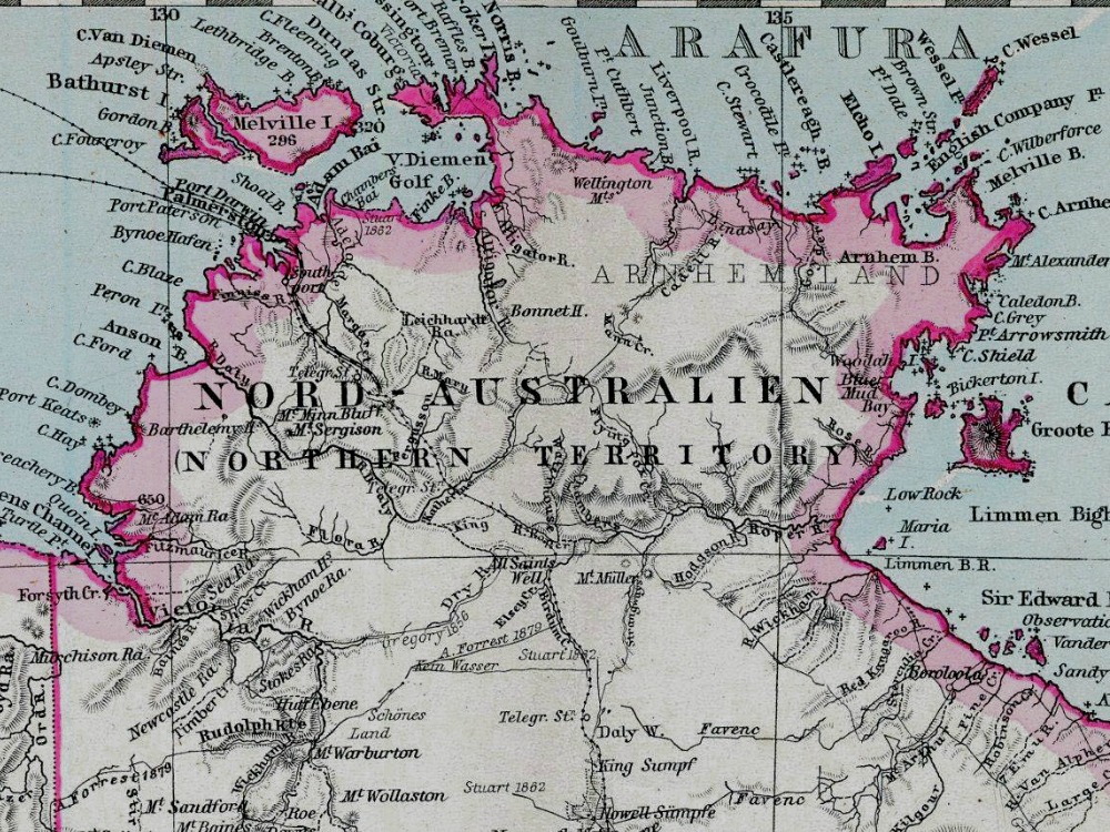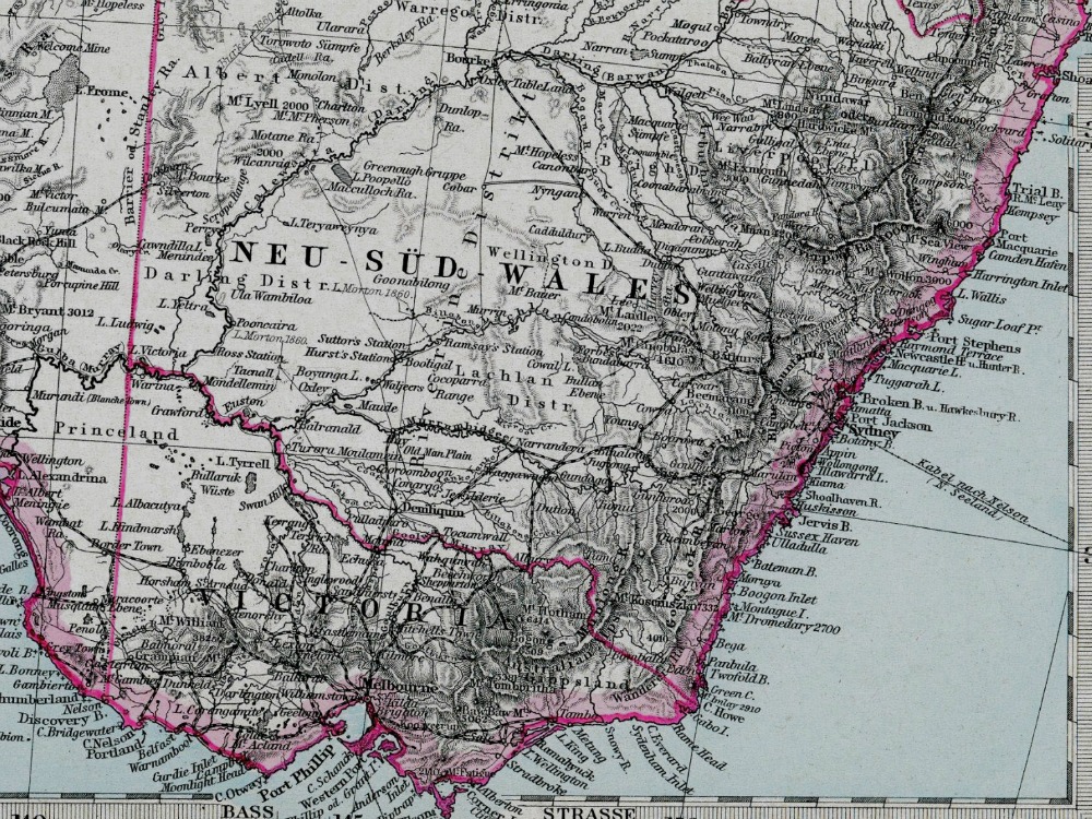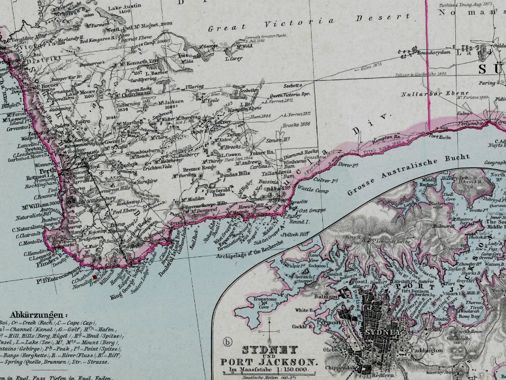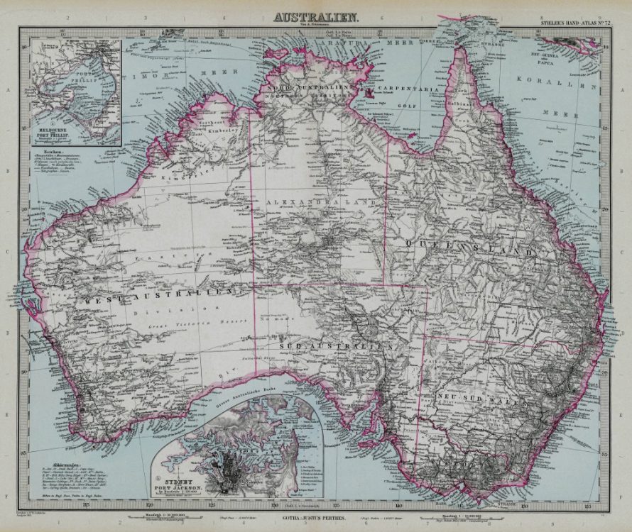 Stieler’s 1891 detailed map of Australia. There are also inset maps of Sydney and Port Jackson and Melbourne and Port Philip. The text is in German.