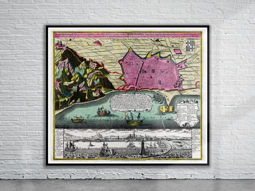 Seutter’s map of Barcelona from 1730. At the bottom is a view of Barcelona from the Harbor, with Monte Serato in the background. At the top, is a view of the fortified town and harbor of Barcelona with a second set of walls on Montjuic (Mont Juif).