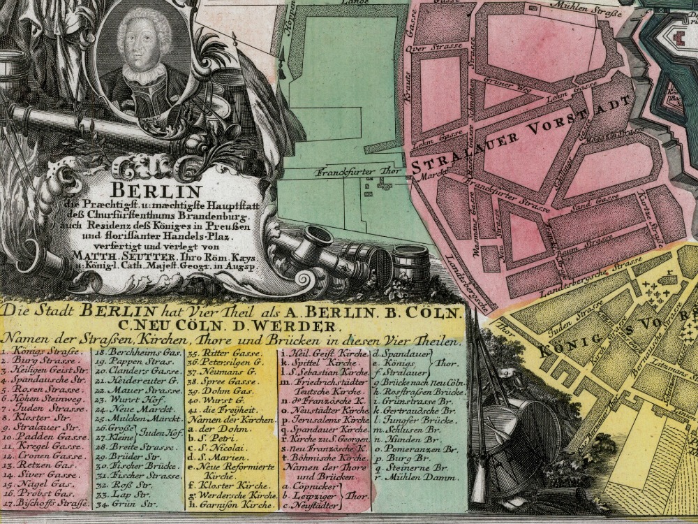 Seutters 1738 colour-coded map and prospect emphasizes the military aspect of the new city of Berlin. Straddling the River Spree is the fortress designed in the 1650s by Johann Gregor Memhardt. The castle walls are prominent in the view of the city from the east. The portrait of King Friedrich Wilhelm I of Prussia is surrounded by military trophies, including cannon, standards and drums.
