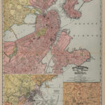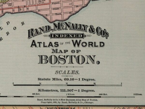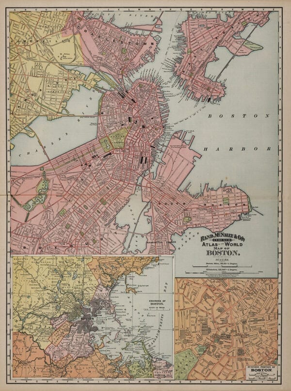 An 1891 Map of the City of Boston by Rand McNally. The map depicts parks, piers, railways and ferry lines as well as many individual streets and buildings.