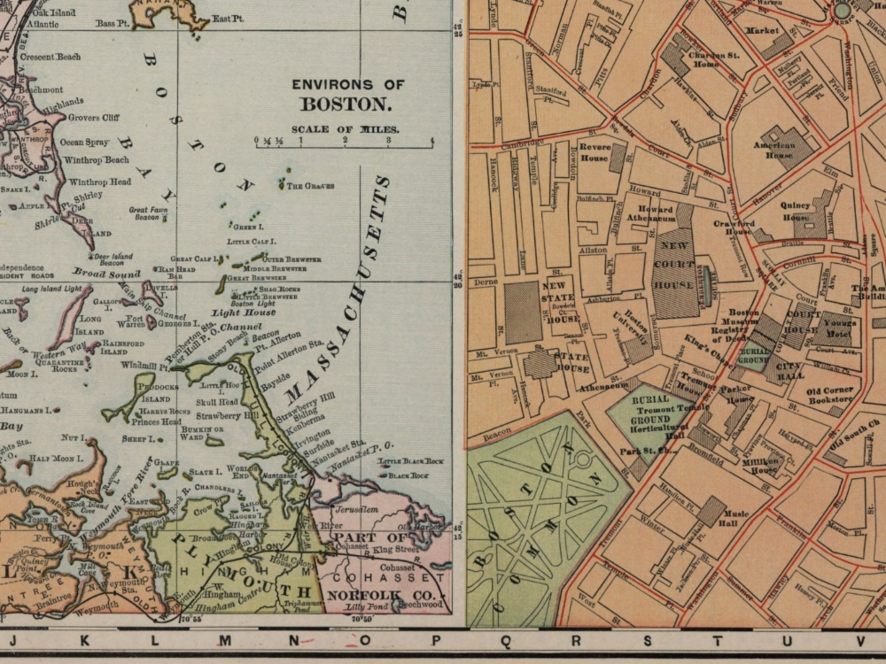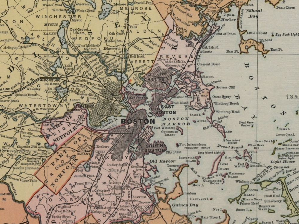 An 1891 Map of the City of Boston by Rand McNally. The map depicts parks, piers, railways and ferry lines as well as many individual streets and buildings.