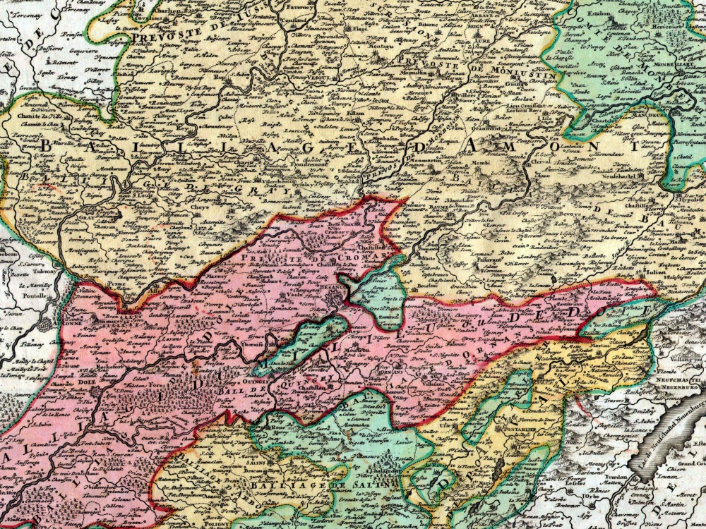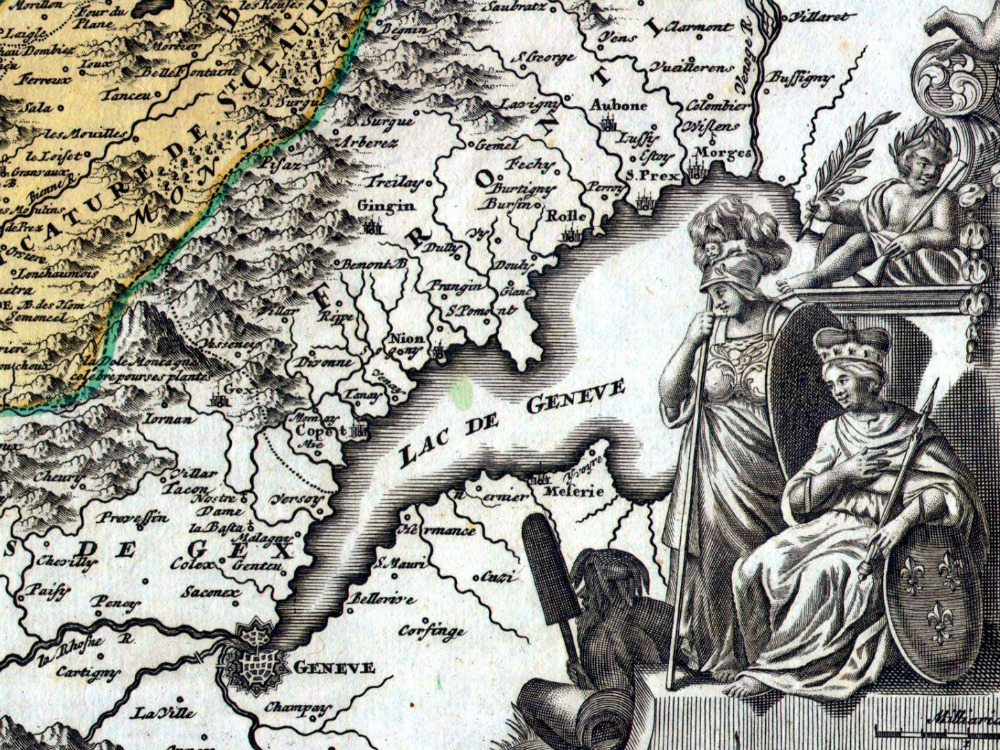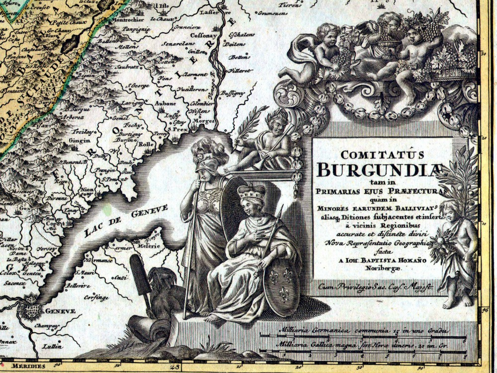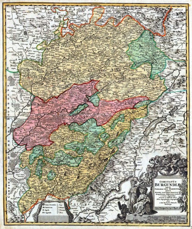 J.B. Homanns 1716 map of Burgundy, one of Frances most important wine regions. Extends to include Lake Geneva in the southwest, Lorraine in the north, Champaigne (Champagne) and Angers to the northwest and Bourgogne to the west. Depicts mountains, forests, castles, and fortifications and features an elaborate title cartouche decorated with cherub winemakers in the bottom right.
