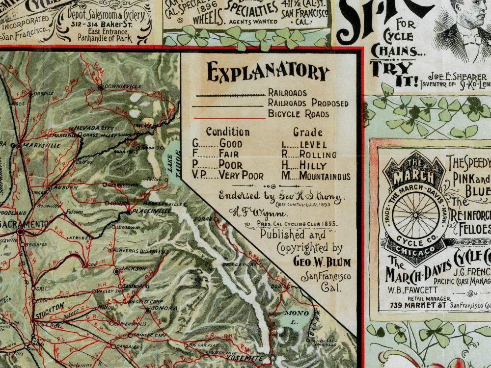 An 1896 Map of California from the Cyclers Guide and Road Book of California, which also included seven smaller sectional maps, a list of hoteliers prepared to offer cyclists rates, and a directory of agents and repairers who might furnish up-to-date information on road conditions.