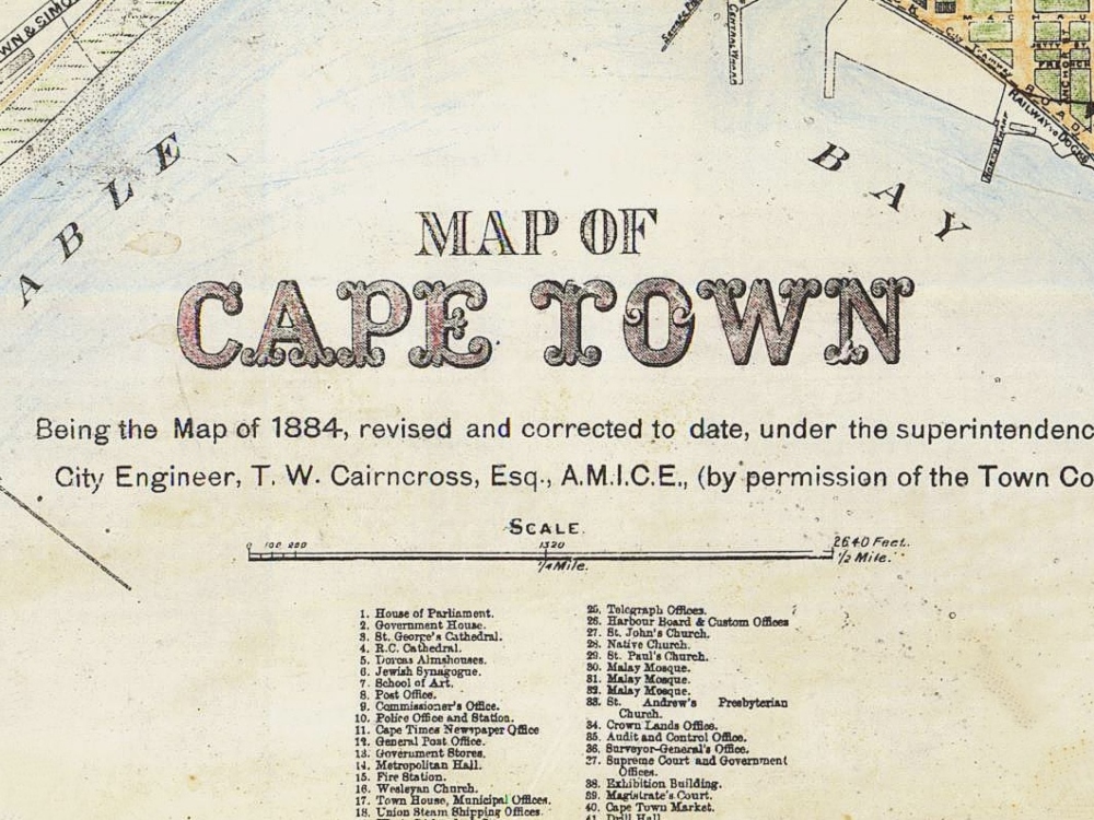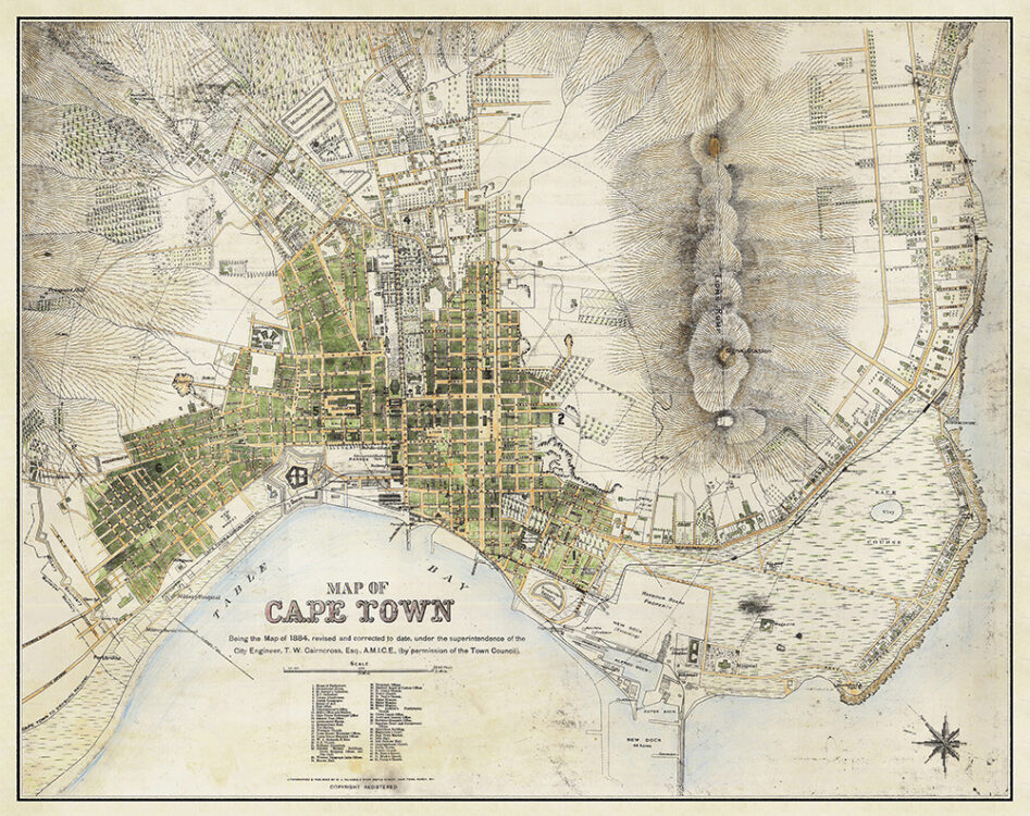 T.W. Cairncross’ Map of Cape Town, South Africa from 1884. The Map depicts the rapidly expanding city under the shadow of Table Mountain.