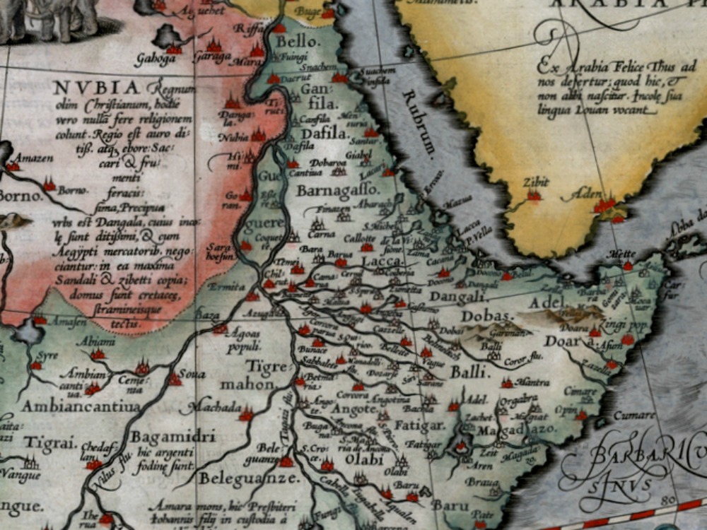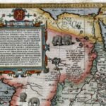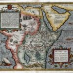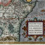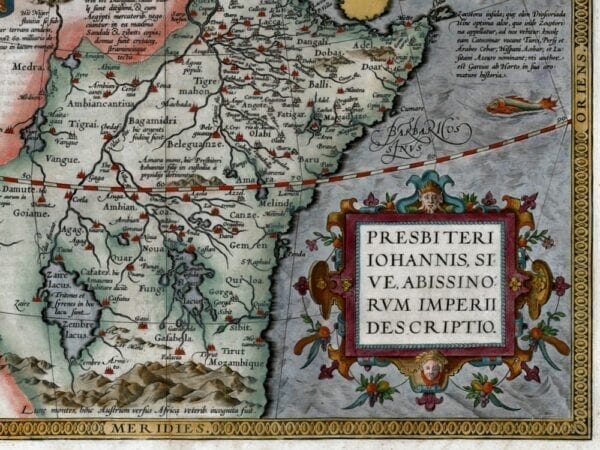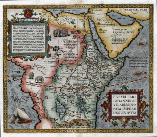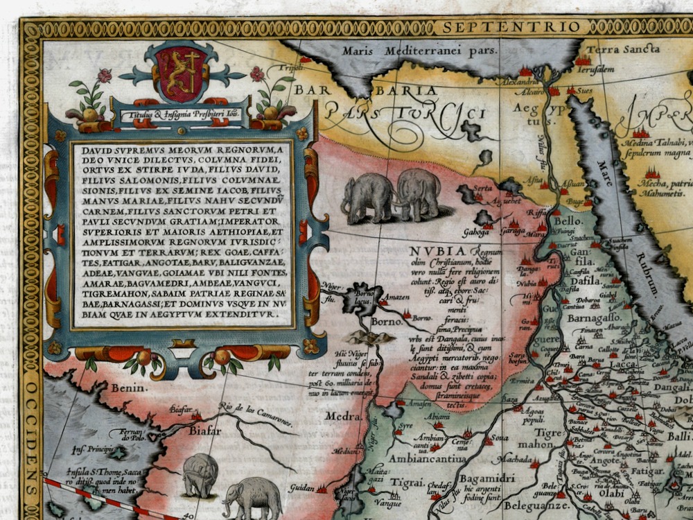 Abraham Ortelius’ famous map of the Kingdom of Prester John, from his Theatrum Orbis Terrarum. The map shows much of the African continent, along with the Arabian Peninsula and parts of southwest Asia.Elephants can be seen roaming the wide open plains.