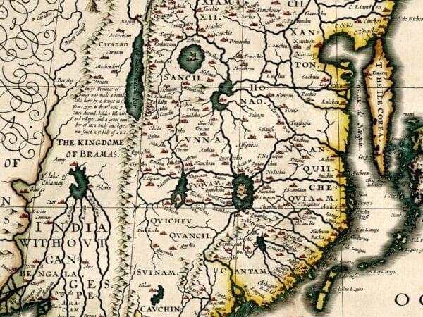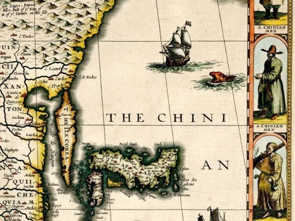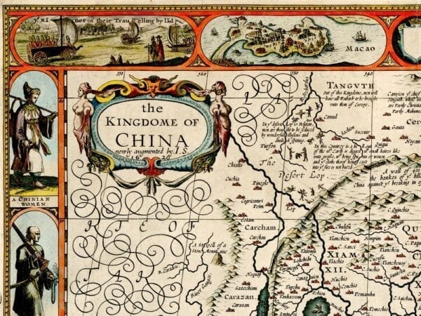 John Speed’s Map of China from 1626. The only carte-a-figures map made of China, Korea and Japan. The Great Wall is shown protecting the Kingdom of China. The decorative panel at top features bird’s-eye plans of Macao and Qyinzay (Hangzhou). The inhabitants of the region are shown at sides, including a very early depiction of a Japanese soldier.