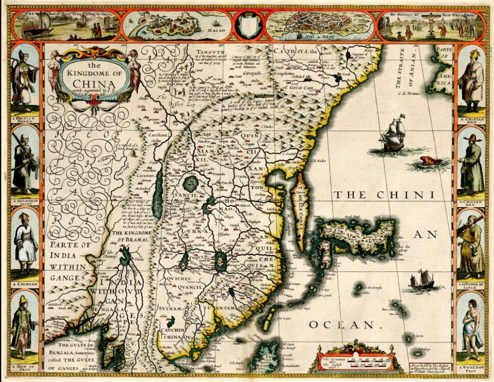 John Speed’s Map of China from 1626. The only carte-a-figures map made of China, Korea and Japan. The Great Wall is shown protecting the Kingdom of China. The decorative panel at top features bird’s-eye plans of Macao and Qyinzay (Hangzhou). The inhabitants of the region are shown at sides, including a very early depiction of a Japanese soldier.