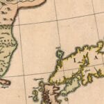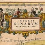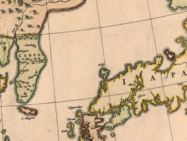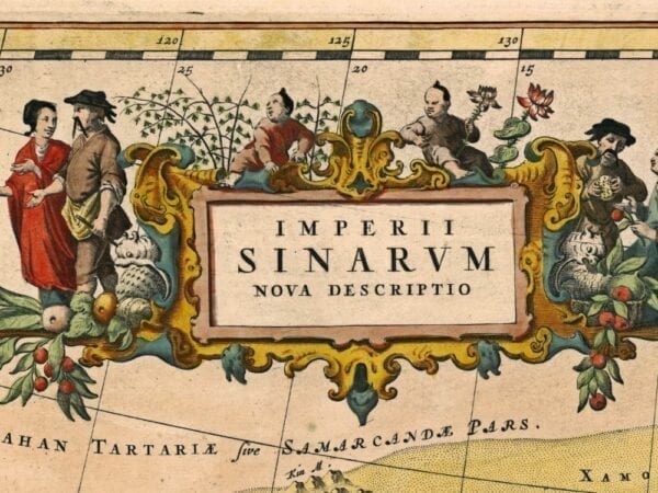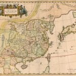 Blaeu’s 1654 Map of China and Japan after the Jesuit Martino Martini who travelled in inland China for seven years. One of the only 17th century maps of the Chinese Empire. Along the top of the map is the Great Wall of China.