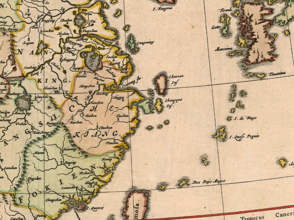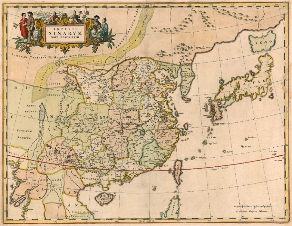 Blaeu’s 1654 Map of China and Japan after the Jesuit Martino Martini who travelled in inland China for seven years. One of the only 17th century maps of the Chinese Empire. Along the top of the map is the Great Wall of China.
