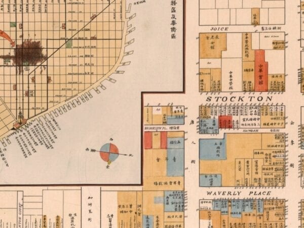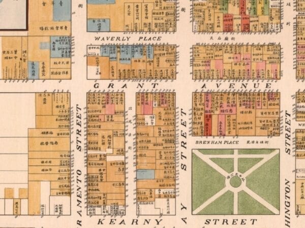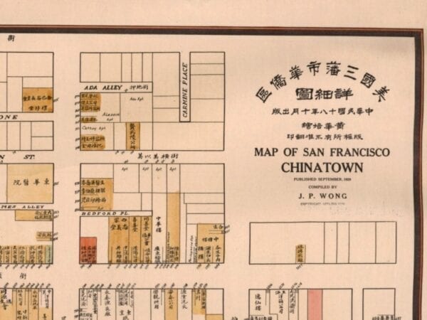 Vintage Map of San Francisco’s Chinatown from 1929. The map depicts the largest Chinatown in North America during the Roaring ’20s, an especially dramatic period in the neighborhood’s history. It shows city blocks and building lots, each with appropriate street address numbers.