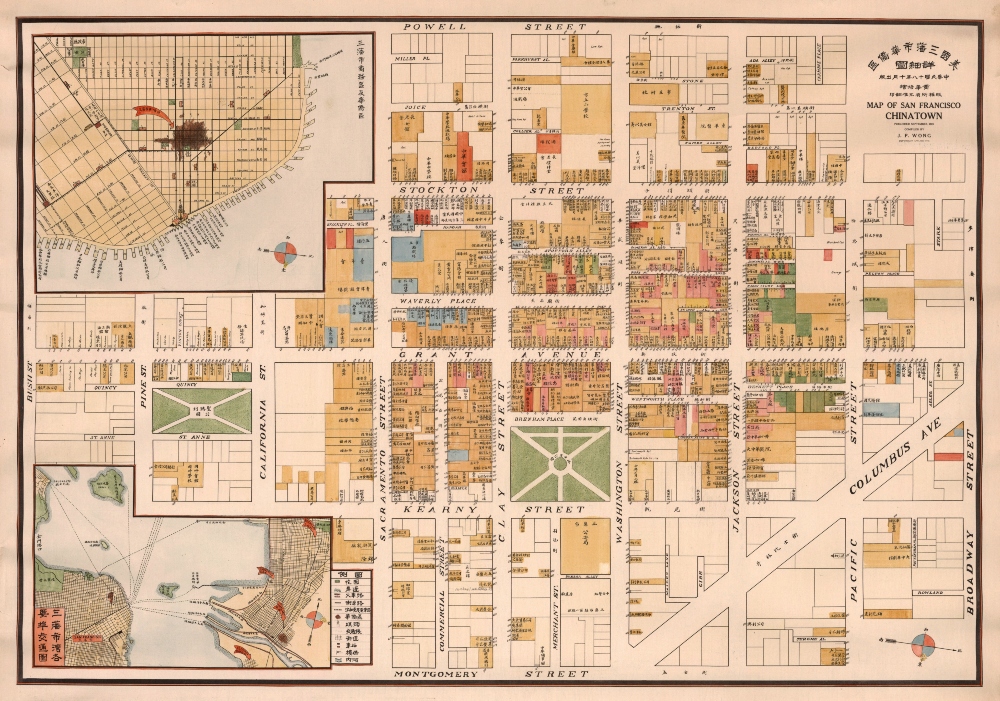 Vintage Map of San Francisco’s Chinatown from 1929. The map depicts the largest Chinatown in North America during the Roaring ’20s, an especially dramatic period in the neighborhood’s history. It shows city blocks and building lots, each with appropriate street address numbers.
