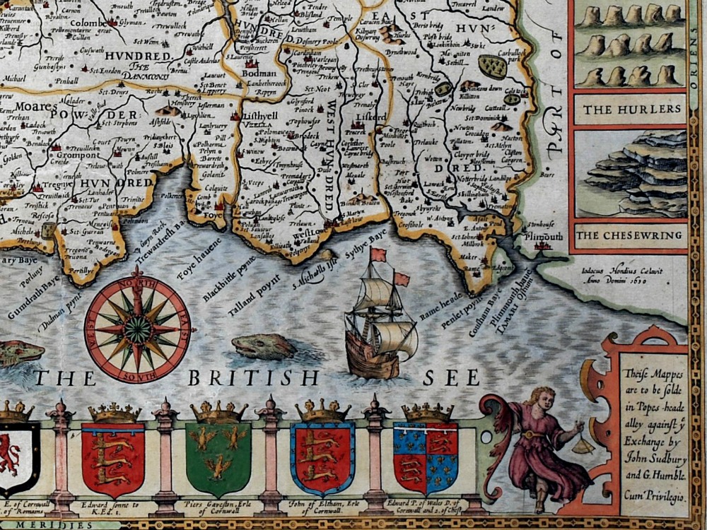 John Speed’s Medieval Map of Cornwall from 1611. The Map first appeared in Speed’s Theatre of the Empire of Great Britaine is one of the worlds great cartographic treasures. Published in 1611/12, it marked the first time that comprehensive plans of English and Welsh counties and towns were made available in print.