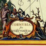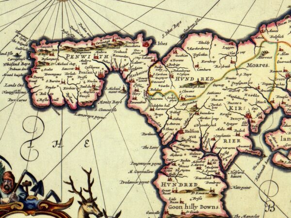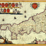 Vintage Map of Cornwall from the Atlas Van der Hagen in 1690. The map shows various coats of arms of prominent Cornish families of the period.