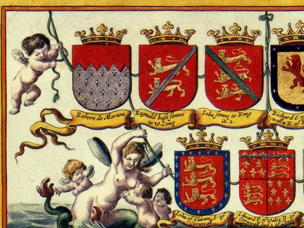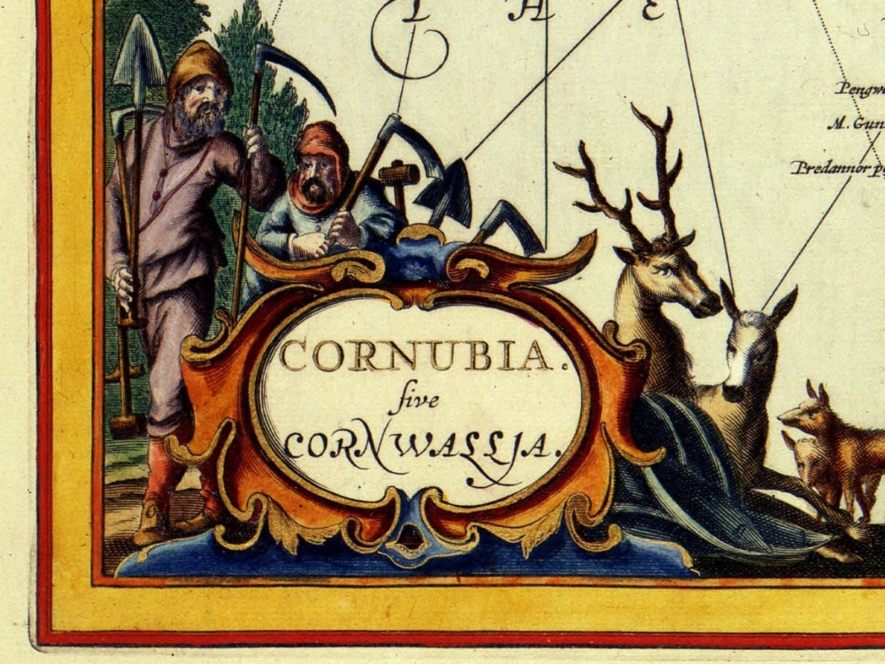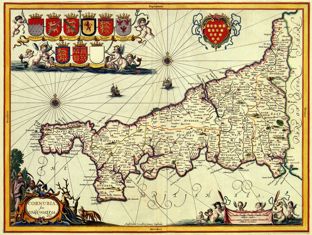Vintage Map of Cornwall from the Atlas Van der Hagen in 1690. The map shows various coats of arms of prominent Cornish families of the period.