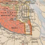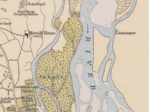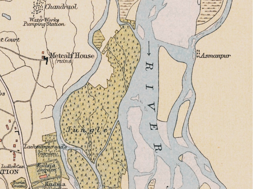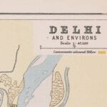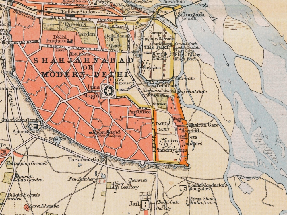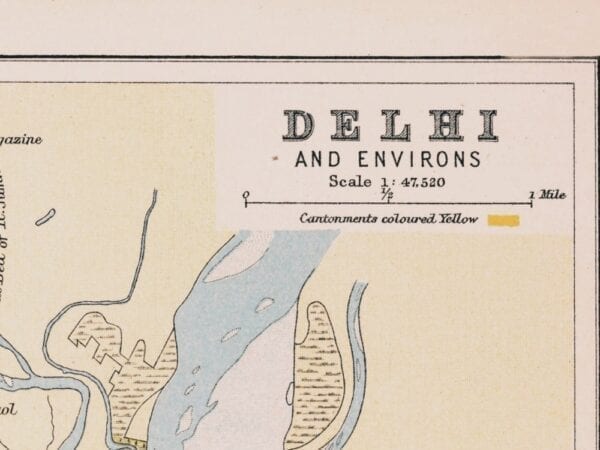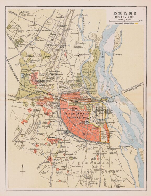 Nicely coloured map of Delhi, India. The map shows towns, roads, railroads, ports, landmarks, public buildings, parks, rivers, bridges and canals.