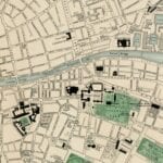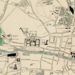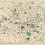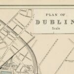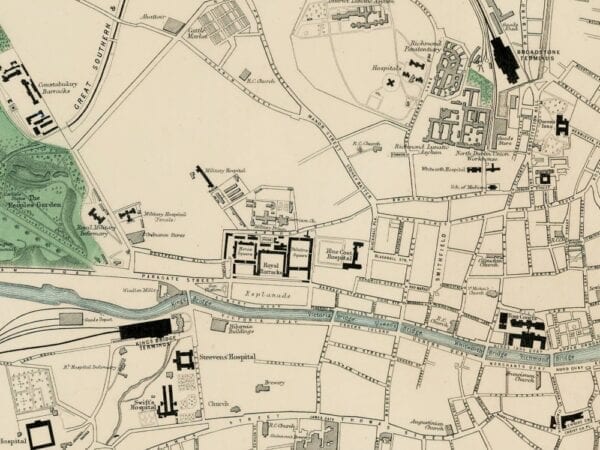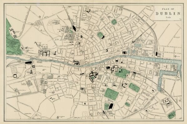 Vintage Map of Dublin from 1880 showing the streets, train stations, parks and major administrative buildings.